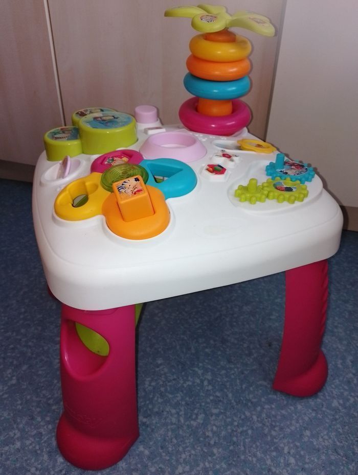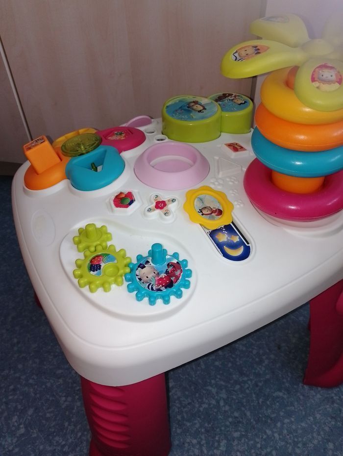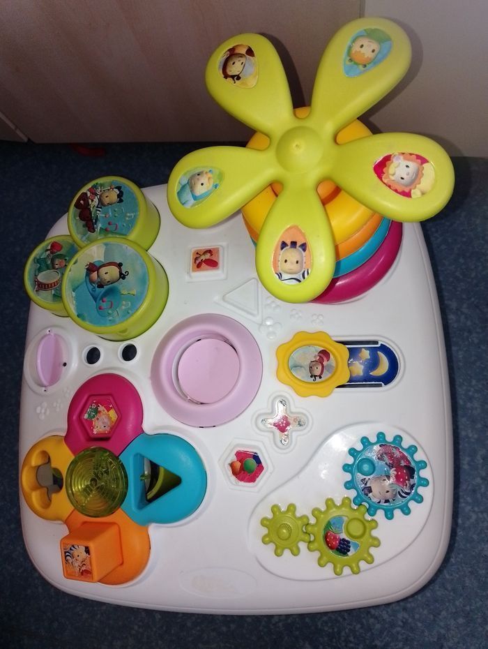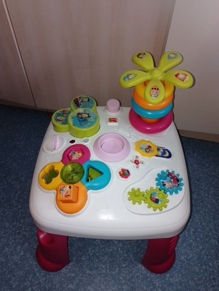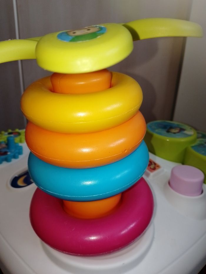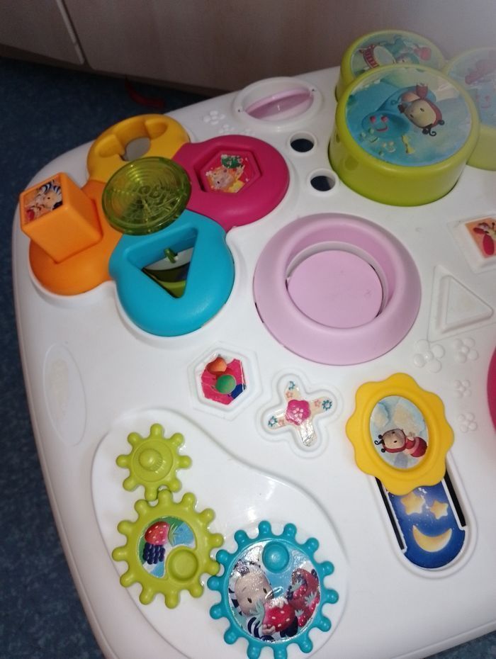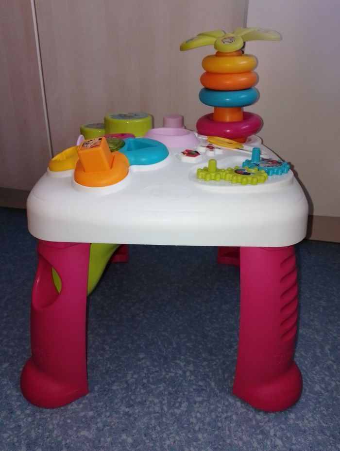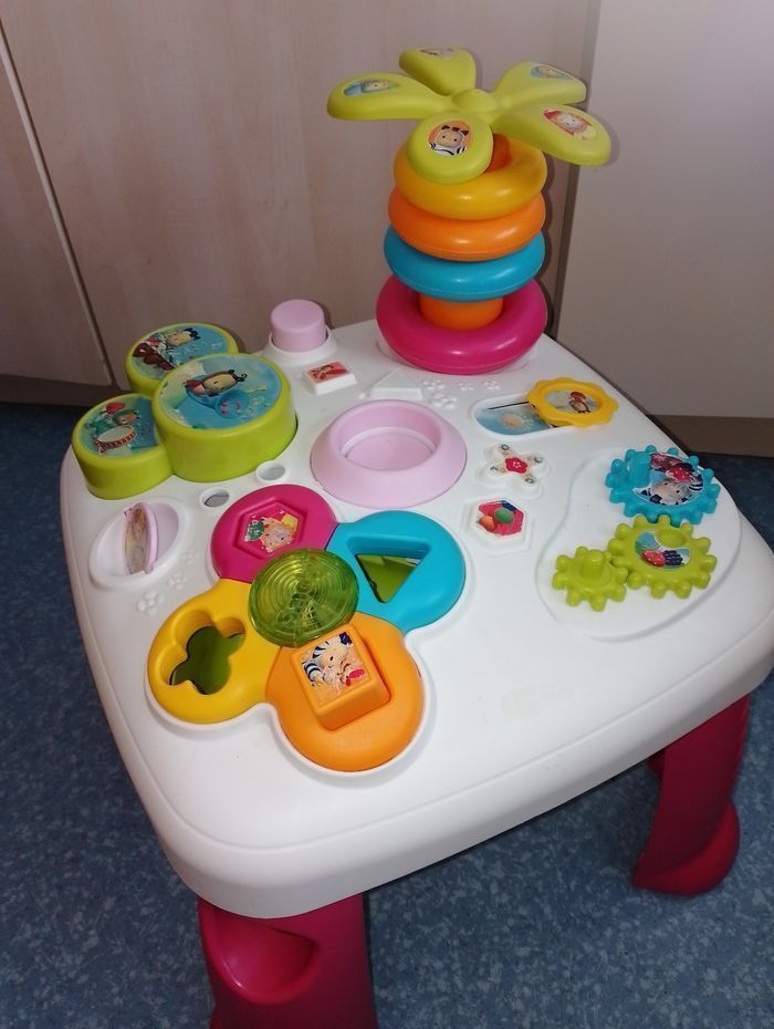 Table d'éveil et d'activités COTOONS smoby En bon état de fonctionnement 3 formes sur les 4 (dispo le rose, le jaune et l'orange non visible sur la photo) manque le bleu manque le personnage (sauteur) du milieu, 1 anneau vert, Et quelques accessoires de décoration
