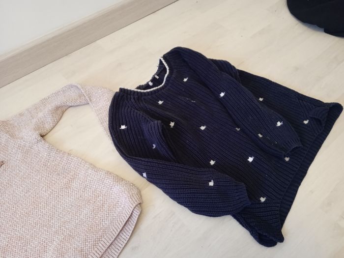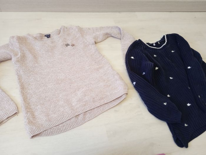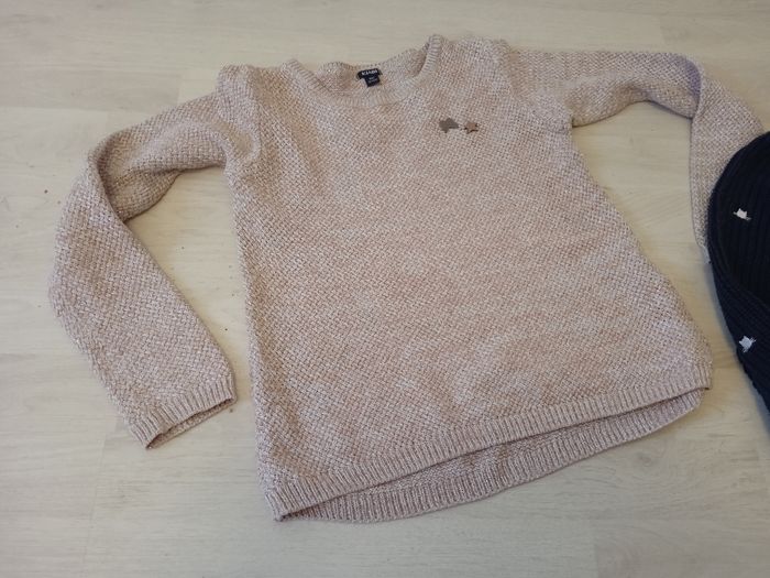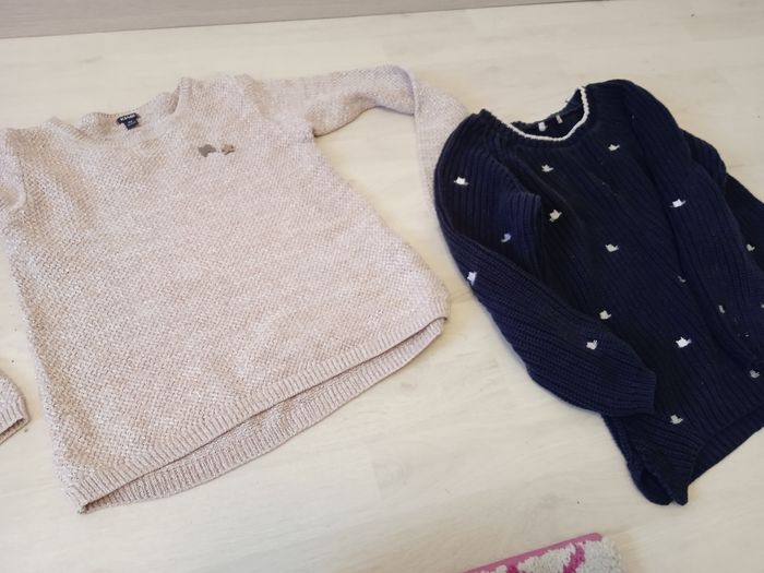 Bonjour je vends se petit loup de 2 pull fille 10 ans Un pull rose clair 10 ans fille marque Kiabi Un pull bleu foncé foncé 10 ans fille marque u avec des motifs dessus en forme de tête de chat ( étiquettes coupé pour la taille)