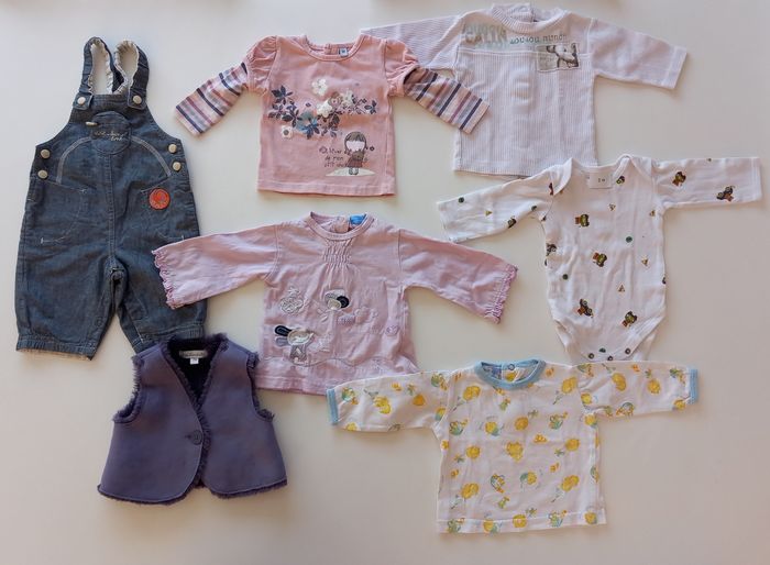 Lot composé de : 4 tee-shirts 1 body manches longues 1 salopette en jeans 1 gilet fourrure Taille 3 mois