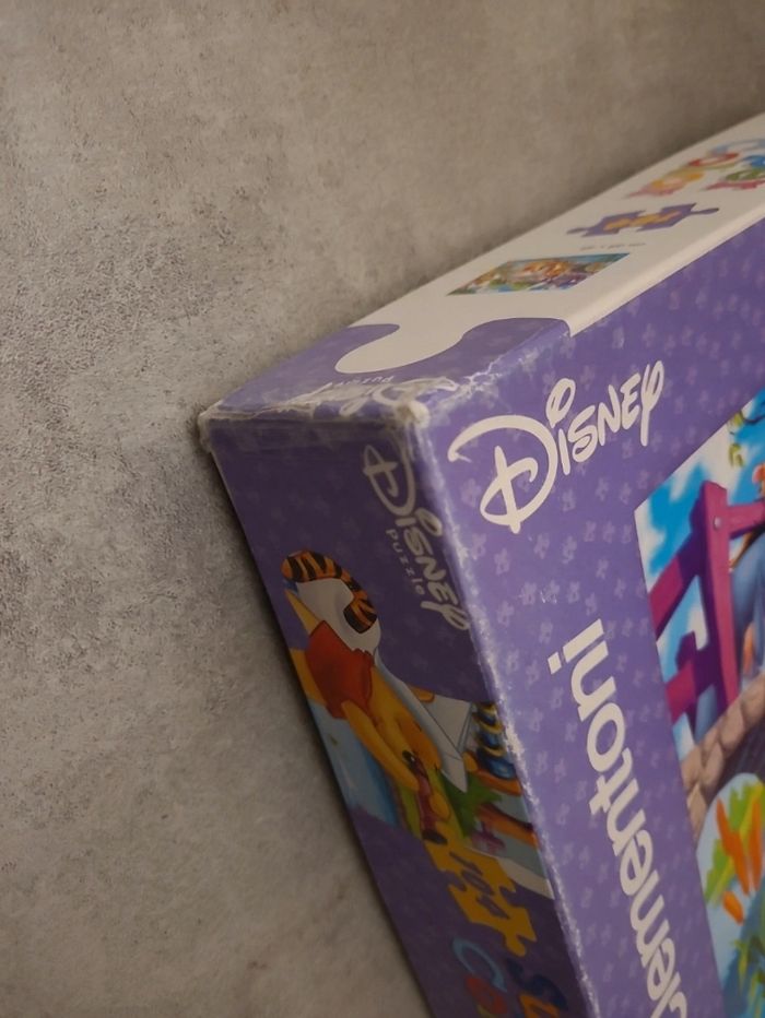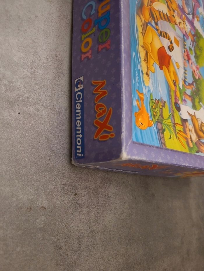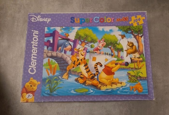 Puzzle disney Winnie l'ourson 104 pieces complet Dimension de chaque piece 9 cm Dimension du puzzle monté a peu près 60cm sur 70cm Boîte réparée aux angles. Marque Clementoni