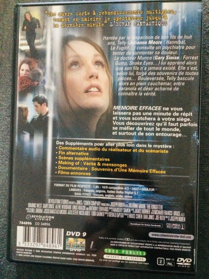 DVD Mémoire Effacée de Joseph Ruben avec Julianne Moore, Anthony Edwards, Gary Sinise... Langue: Anglais, Français & Italien Sous-titres: Anglais, Français, Italien & Arabe Zone 2 En livraison ou remise en main propre à Montpellier Possibilité de vente en lot > voir mes autres annonces DVDs