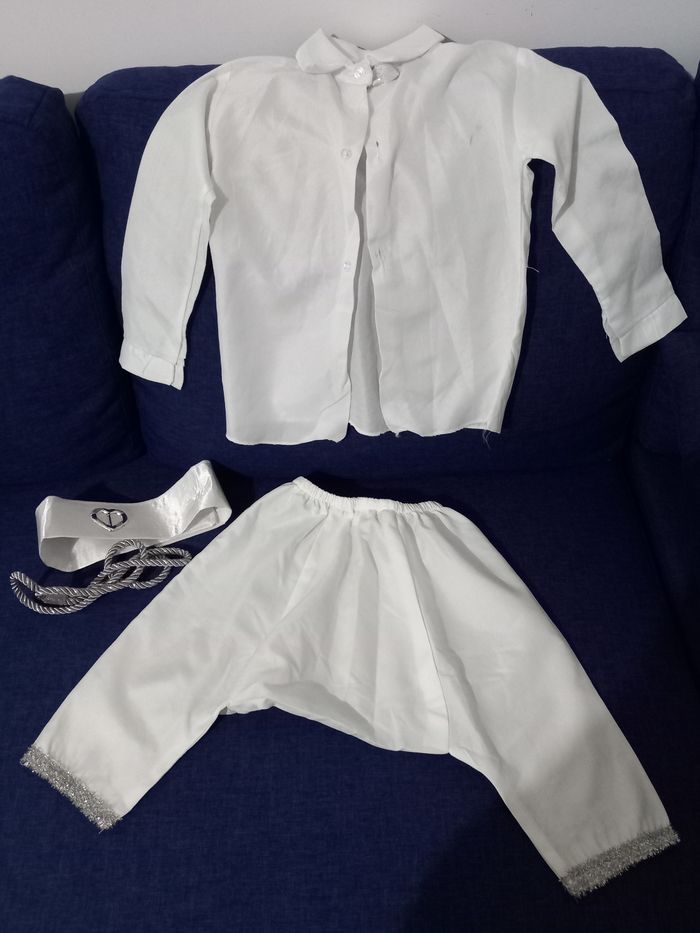 Bonjour, Je revend cet joli ensemble pour cérémonie acheté pour un baptême mais finalement bébé ne pourra pas le mettre car chemise trop grande pour lui, tissu trop fin pour la saison à laquelle aura lieu le baptême. Jamais porté, en état tel que acheté, sans etiquette ni emballage d'origine. Pas d'envois, à venir récupérer sur place