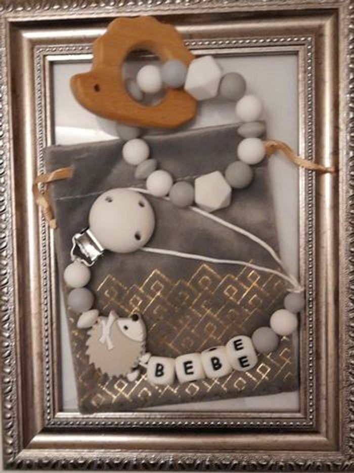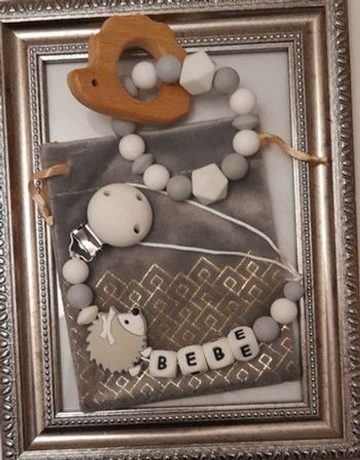 Ensemble Attache tétine personnalisé et anneau de dentition avec le prénom de votre choix avec adaptateur pour les tétines mam si vous en avez besoin et pochette cadeau. Réalisation et envoie sous 48h salon le stock disponible. Tout le matériel utilisé est aux normes européennes . Perles en silicone ou en bois ou un mélange selon les modèles . En respectant les normes de sécurité pour bébé ,n'hésitez pas à regarder dans mon dressing il y a plusieurs modèles et aussi à m'envoyer un message pour plus d'informations. 🔴 une petite remarque pour les prénoms qui sont très long il y aura forcément moins de perles sur les cotés ou quelques changements sur le modèle c'est pour respecter les normes de sécurité pour bébé il y a une langueur à respecter merci pour votre compréhension. 🔴Aussi l'utilisation de l'attache doit être sous surveillance et toujours vérifier si l attache tétine est intacte et les nœuds sont toujours bien fermés pour la sécurité de nos boutchous. Je vous remercie pour la lecture de ces consignes