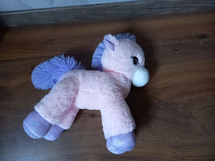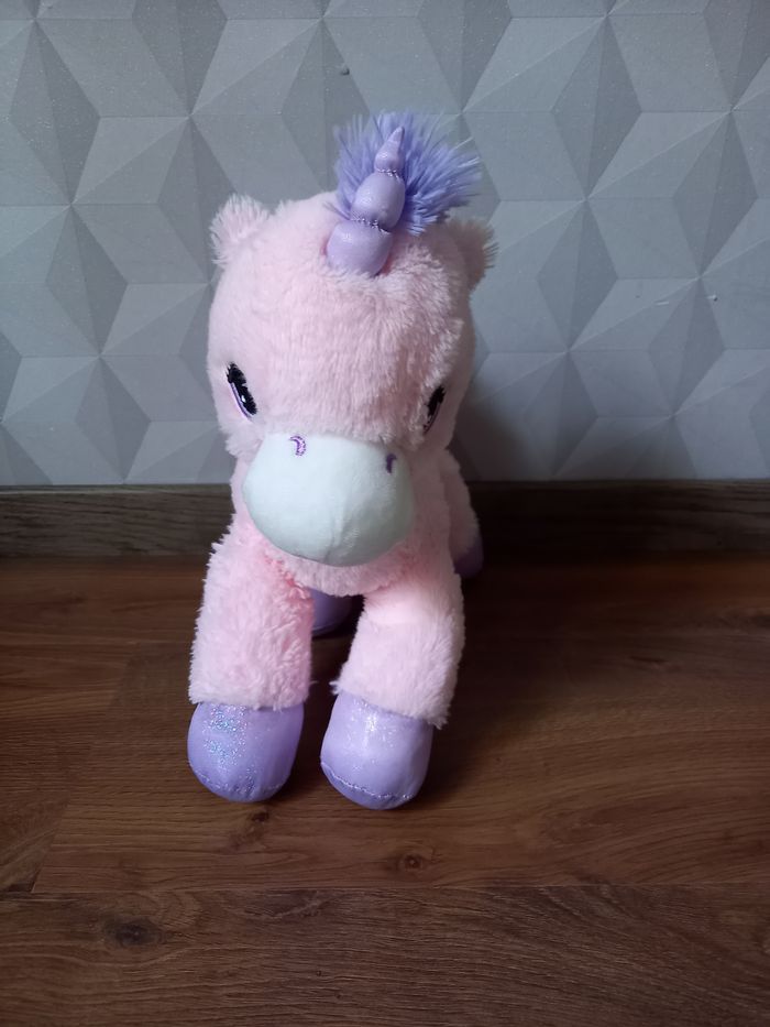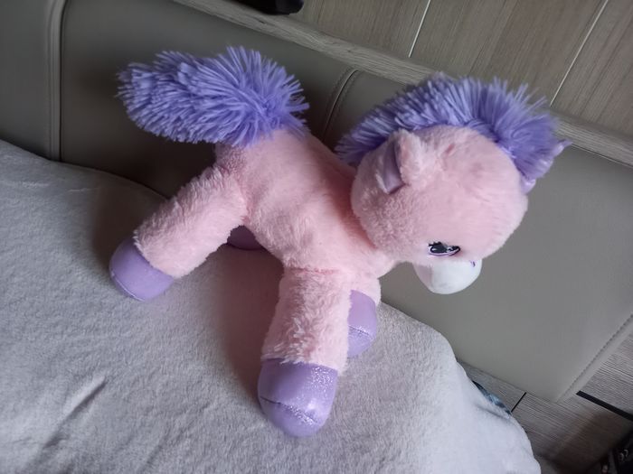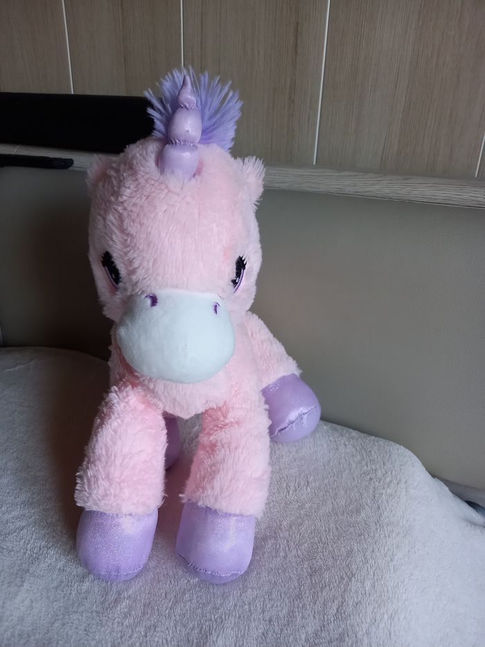 Licorne rose et mauve 100 % polyester Hauteur 35cm Très propre Très bon état.