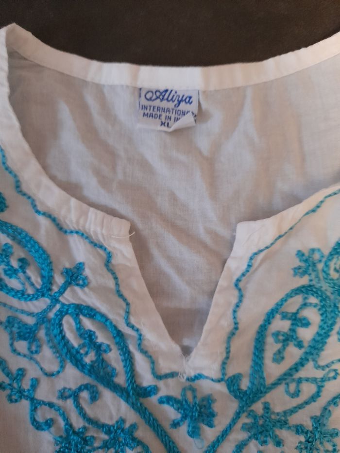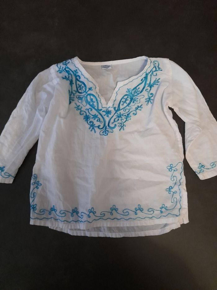 Haut fille blanc avec broderies turquoises L'étiquette indiqué taile xl ce qui correspond à un 4 ans ( 29 cm d'épaule à épaule et 42 cm de hauteur)