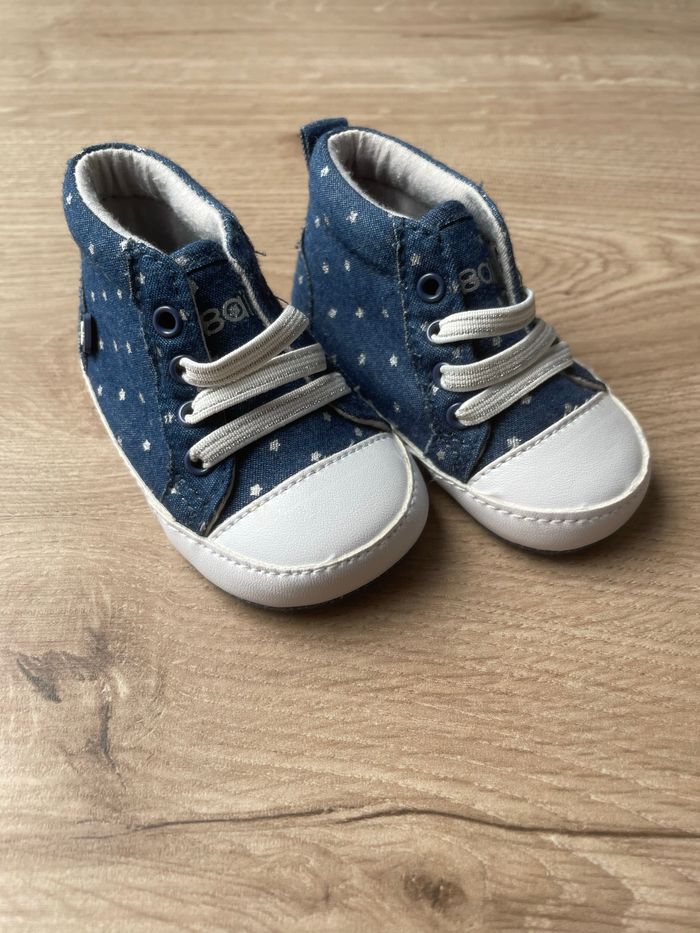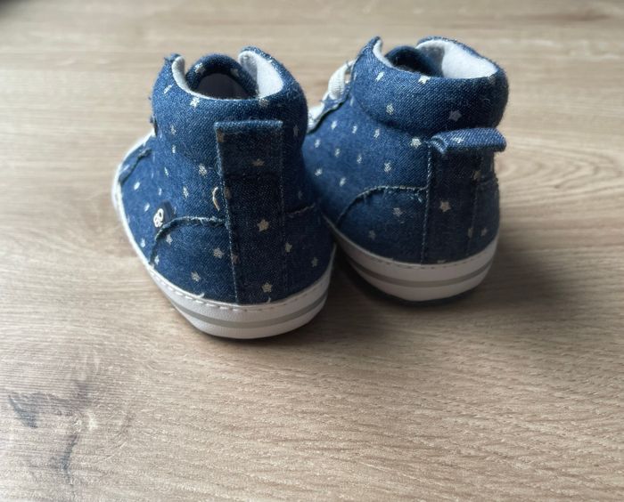 Bonjour je vend une paire de petite basket en toile marine avec des etoiles argenté de chez obabi Pointure 1/6 mois Mis 1/2 fois donc très bon état