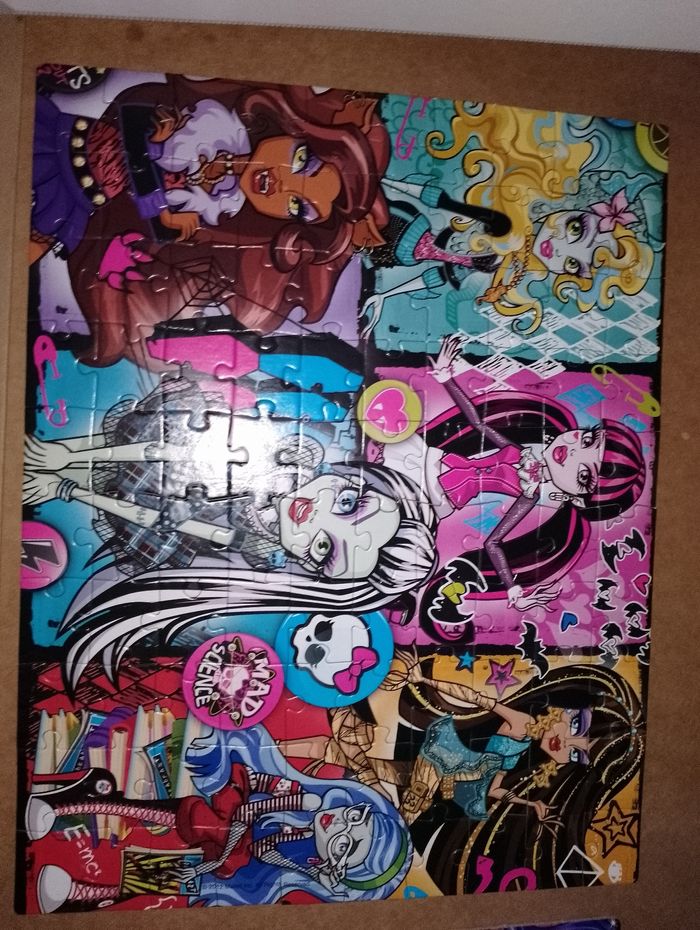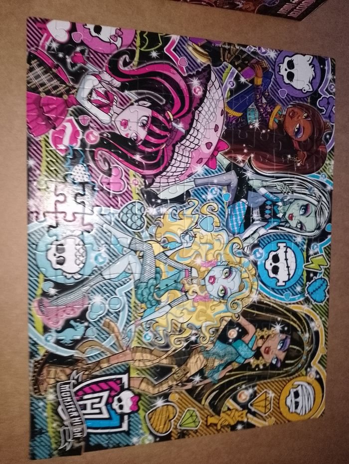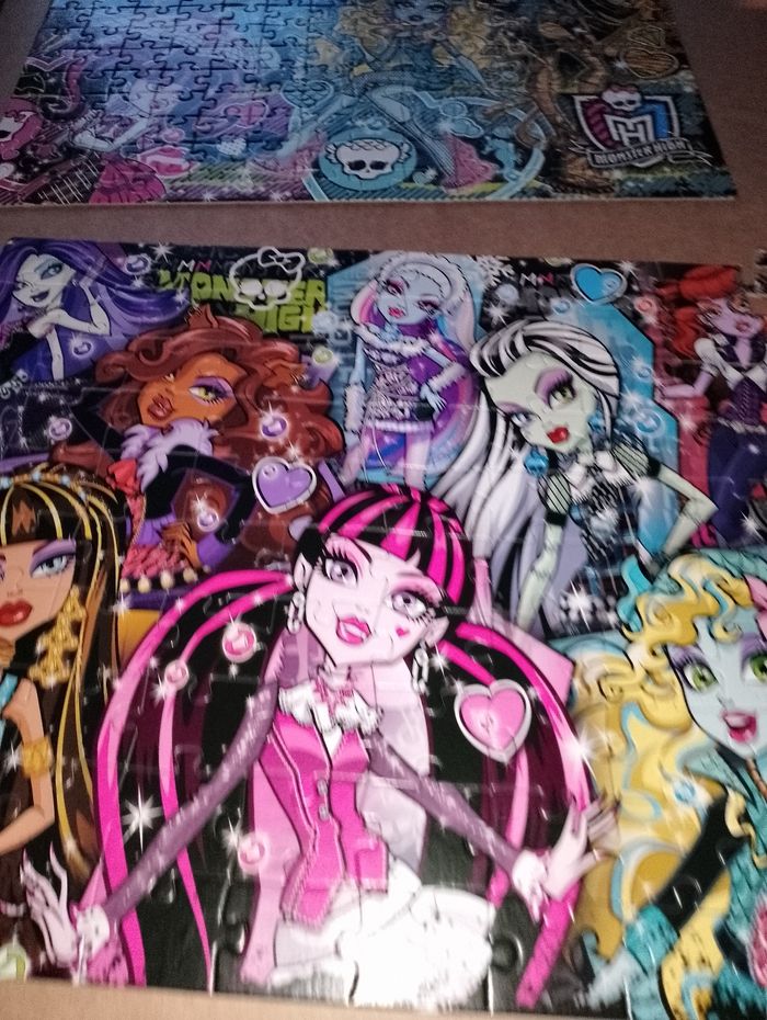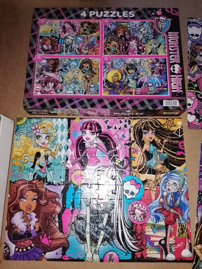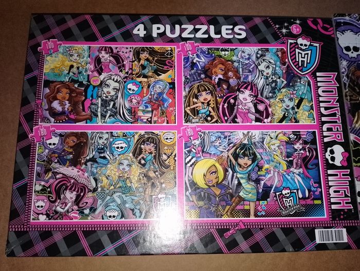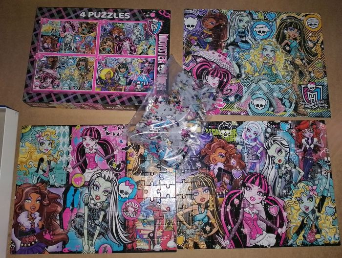Lot de 4 puzzles Monster High Clémentoni 1 encore emballé dans son sachet 180 pièces Les 3 autres en très bon état 2 de 100 pièces et 1 de 180 pièces Boîte en très bon état D'autres Monster High en TBE dispo à la vente Idéal cadeau anniversaire, noël, saint Nicolas, sainte Catherine, Pâques