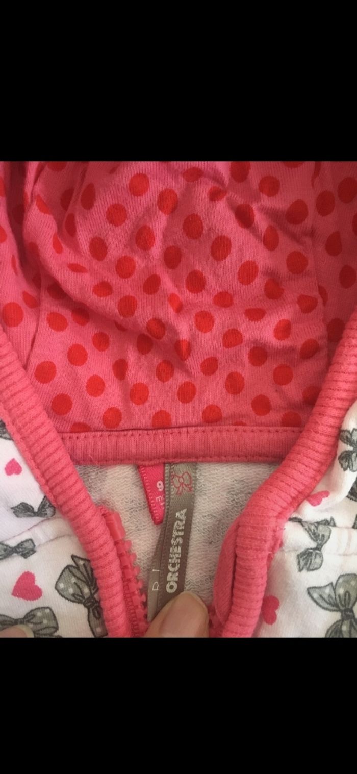 Veste à capuche de la marque orchestra 9 mois. Les motifs sont des rubans et des cœurs