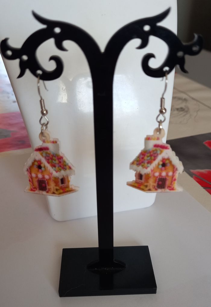 1 jolie paire de boucles d'oreilles motif maison pain d epices. Hauteur : 5 cms. Les boucles sont imprimées recto verso. Boucles neuves sous blister. N'hésitez pas à regarder mes autres ventes. Envoi rapide et soigné.