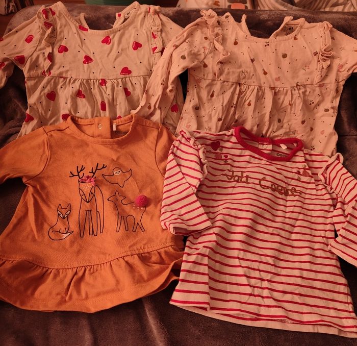 Lot de 4 hauts manches longues taille 6 mois orchestra et kiabi en très bon état