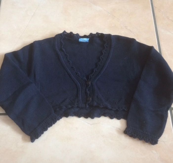 Boléro, manches longues, couleur bleu marine, taille 36 mois. Marque Sardon. Peu utilisé.