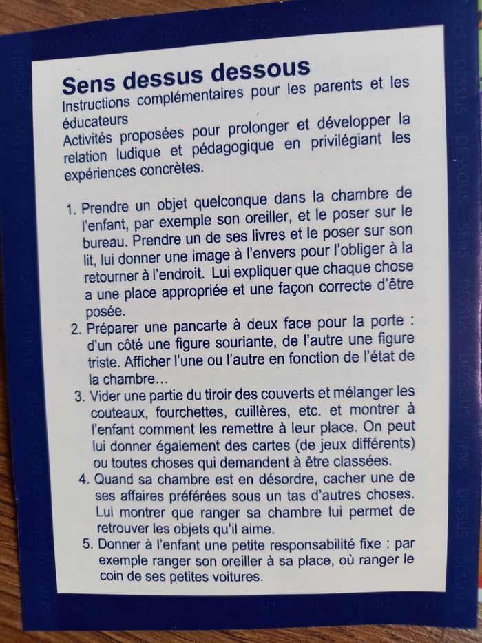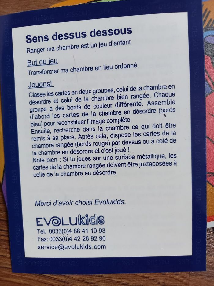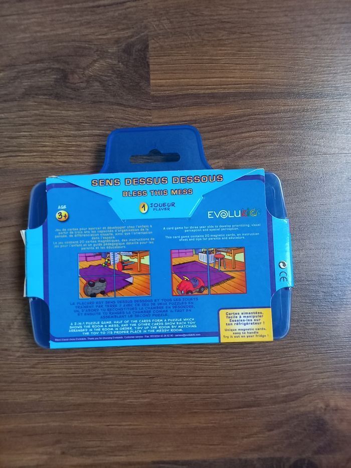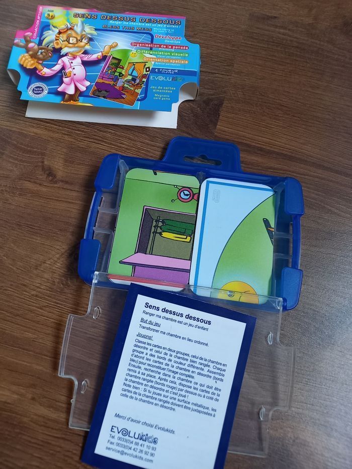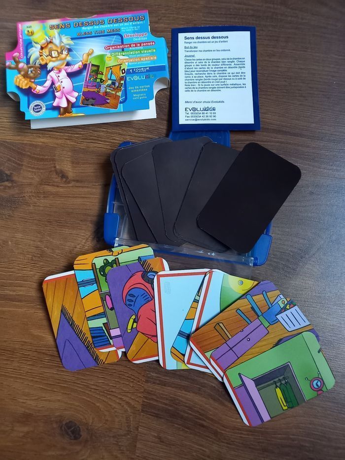 Sens Dessus Dessous Coffret de 20 cartes magnétiques 2 puzzles: la chambre en désordre, la chambre rangée. A partir de 3 ans Marque Evolukids Parfait état.