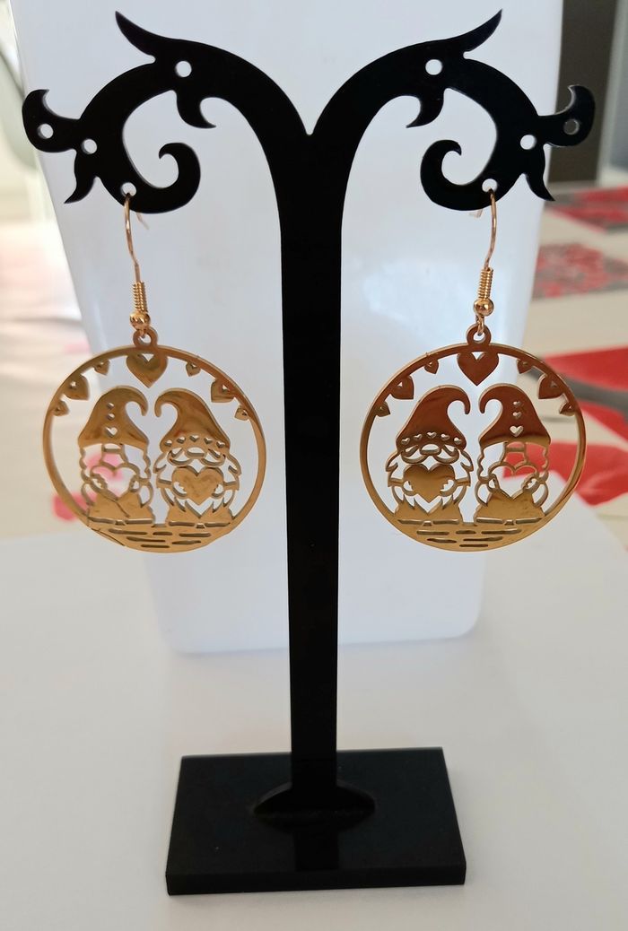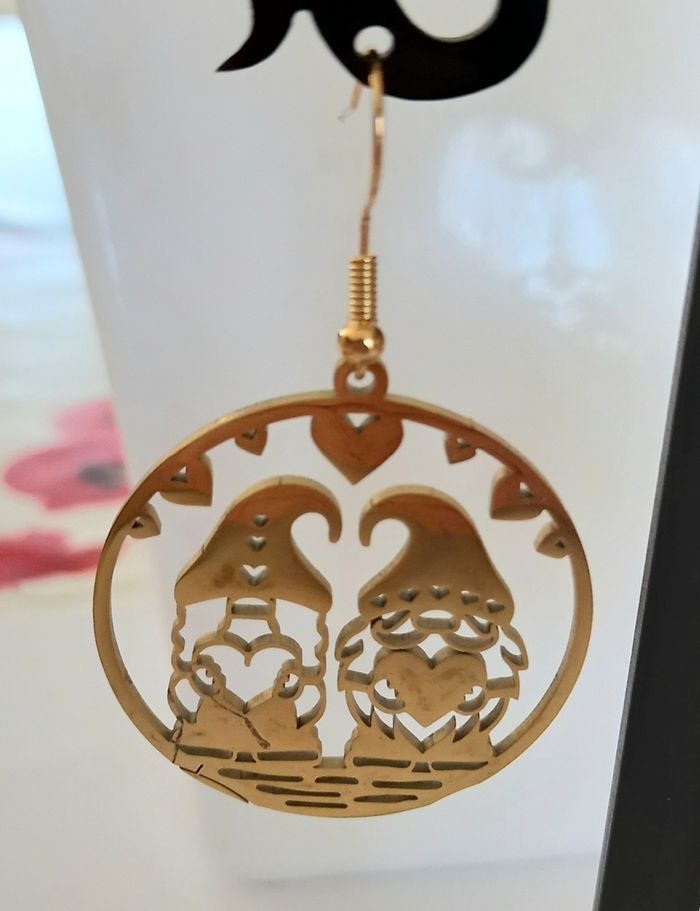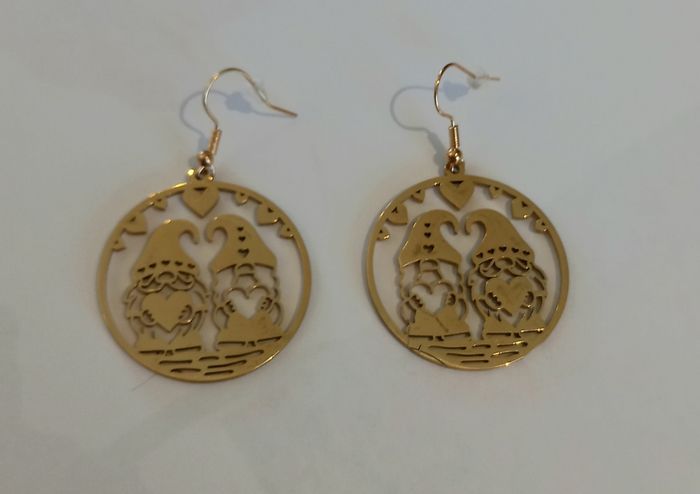 1 jolie paire de boucles d'oreilles motif gnomes. Coloris doré. Hauteur : 5,2 cms. Diamètre : 3,5 cms. Boucles neuves sous blister. N'hésitez pas à regarder mes autres ventes. Envoi rapide et soigné.