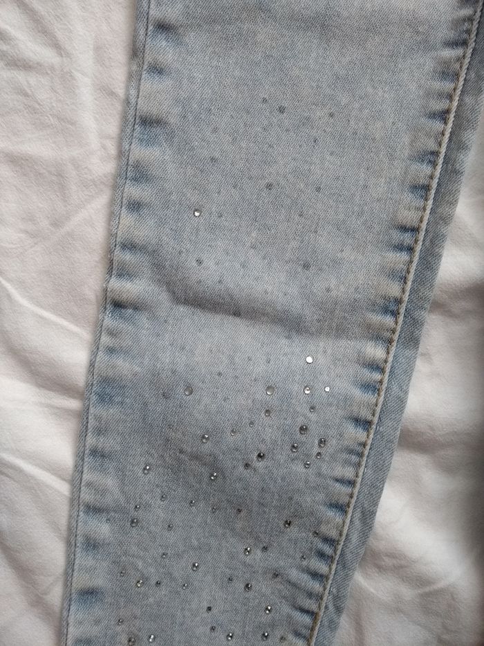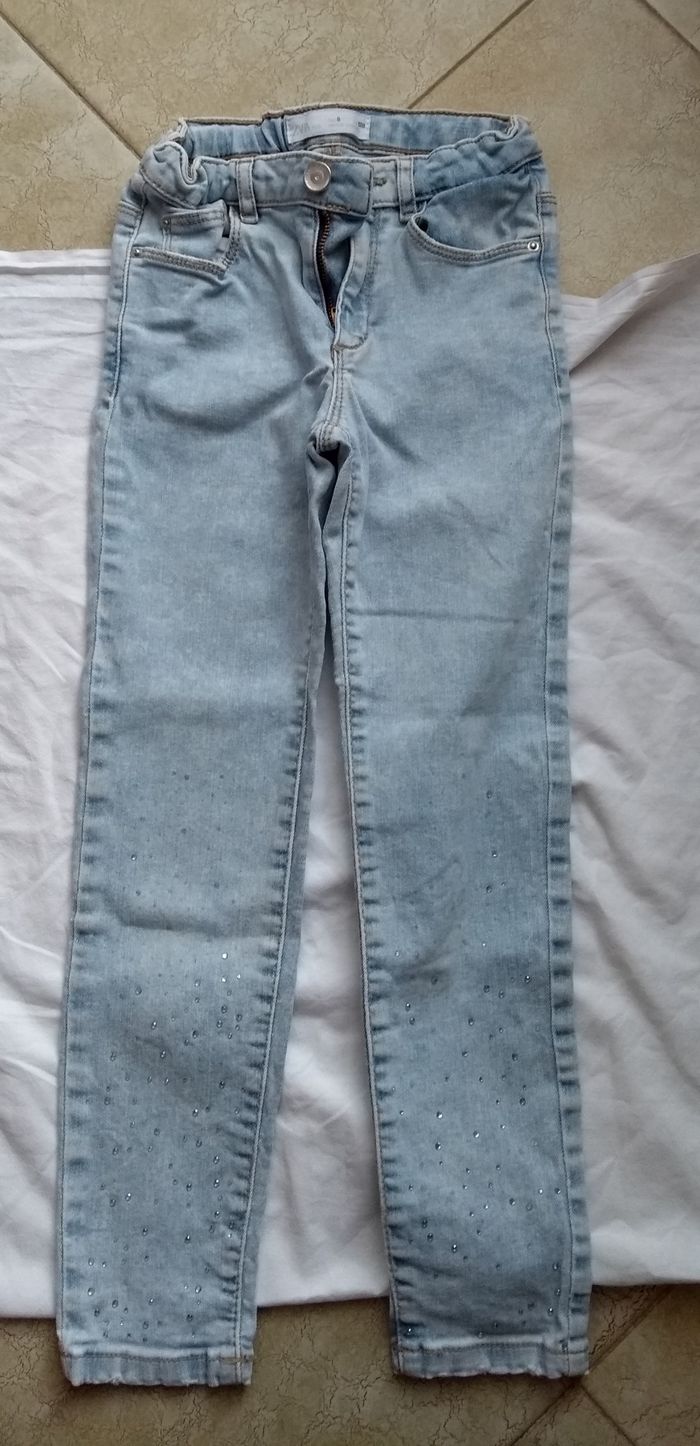 Jeans clair. Avec beaucoup de petits brillants au bas du pantalon. Taille réglable par élastiques. Marque H&M. Taille 8ans. Genoux impeccables. Quelques petites usures au bas du pantalon. Autrement bon état
