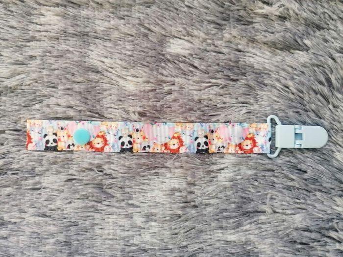 Attache tétine animaux faisant 22cm. Elle peut passer au lave linge ou peut se mettre à trempé car il n'y a aucune partie métallique dedans. Jamais utilisée