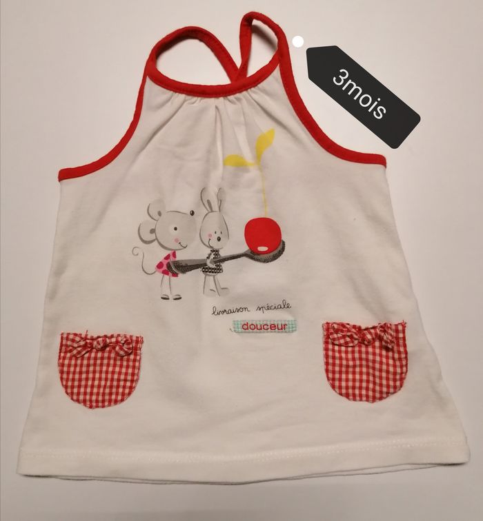 Haut épaule nu ( Bretelles croisé derrière) Marque orchestra Age 3mois (60cm) Couleur blanc /rouge 2 petites poches devant Matière 95%coton. 5%elasthane Portée. Aucune tache 1,50€