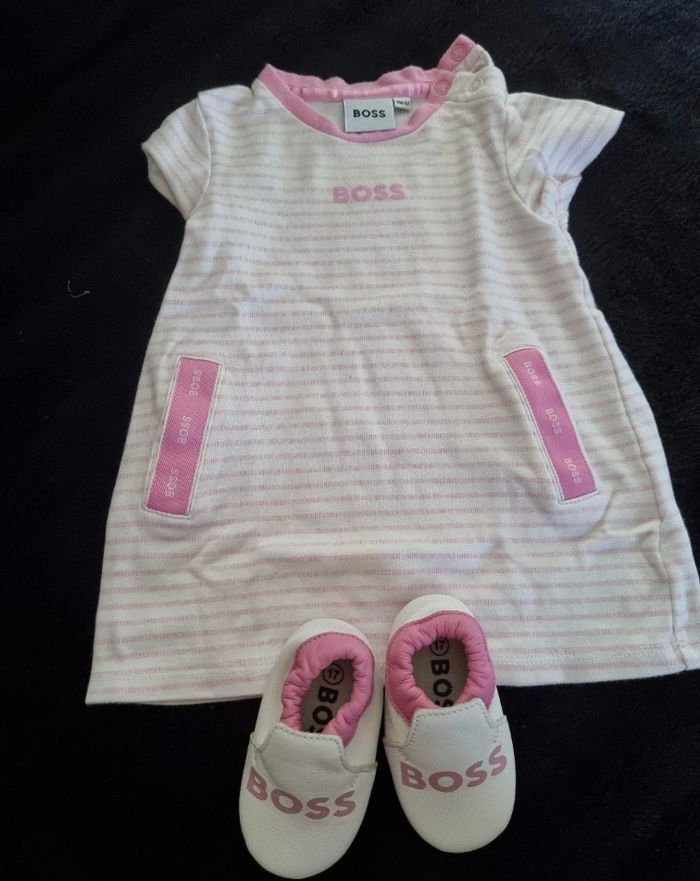 Lot vêtements ( robe kenzo 6 mois ) ( robe boss 6 mois ) ( robe boss 3 mois ) ( ensemble jacadi 6 mois ) ( chaussures boss 17) portés 2/3 fois très bon état