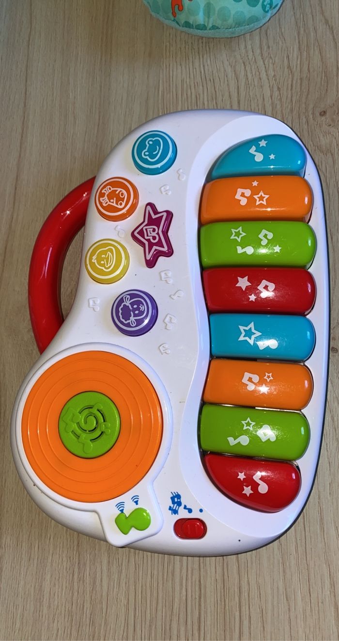 Piano d’éveil Très bon état Juste le cache pour les piles ne tiens pas il y a du scotch Mais ne gêne en rien l’utilisation du jouet