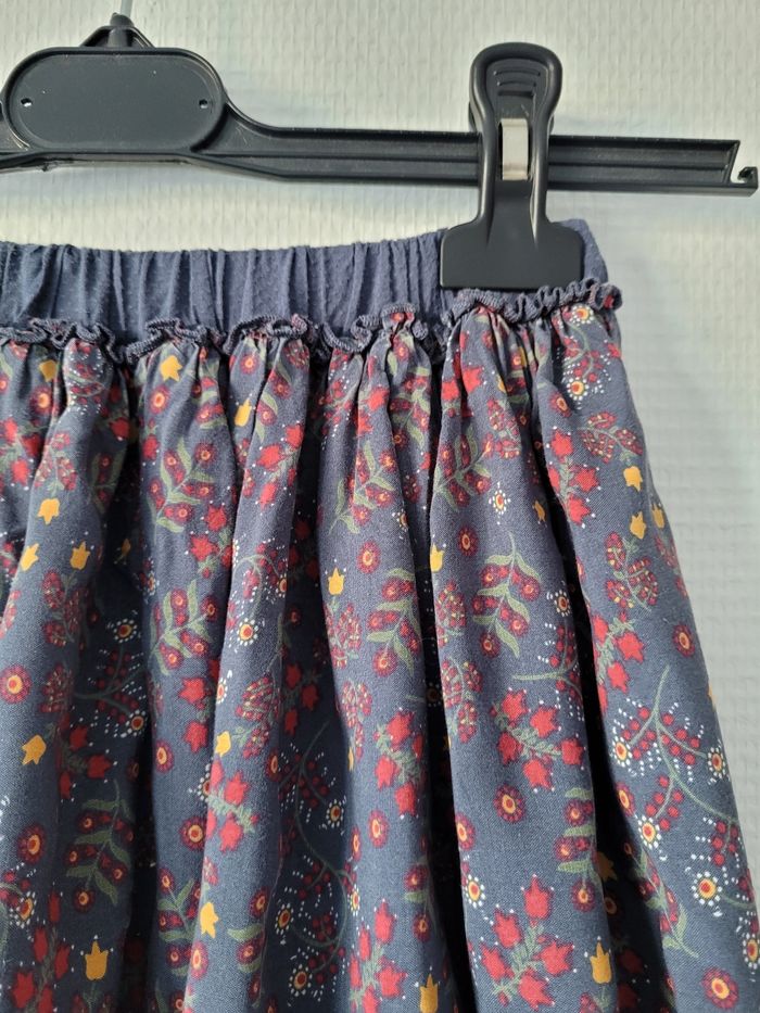 Jupe bleu ardoise de marque Tape à l'œil taille 10 ans Imprimé fleurs et feuillage rouge/kaki/moutarde Doublure qui dépasse Totalement elastiquée à la taille Plus d'étiquette En très bon état
