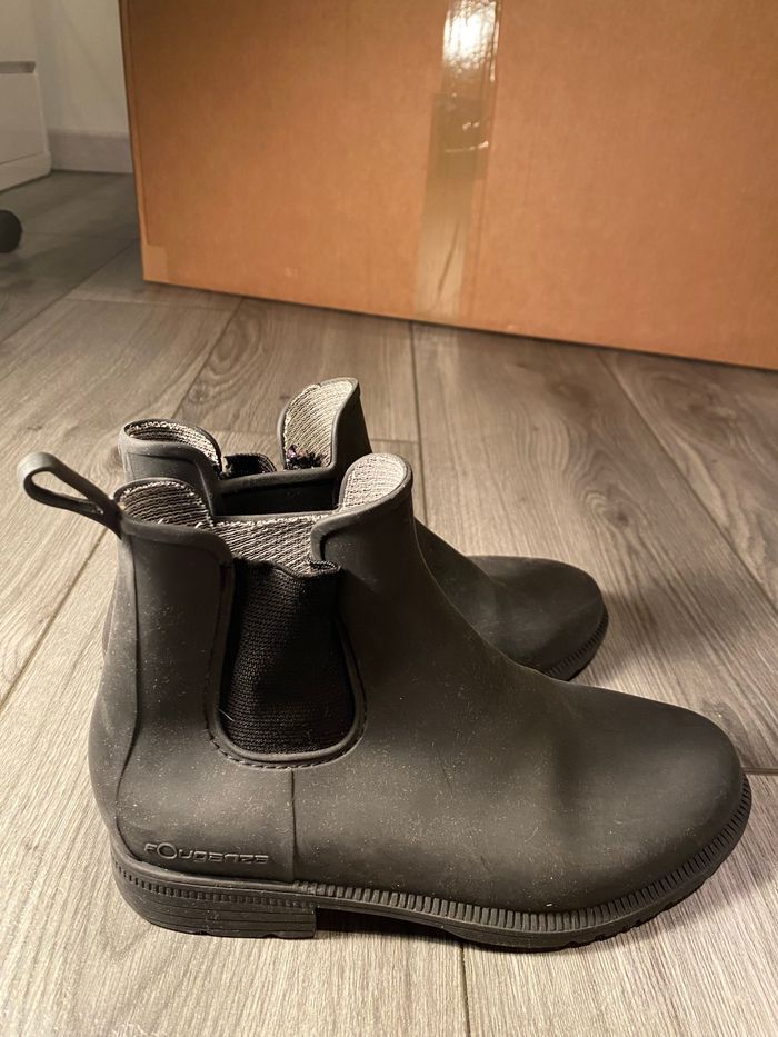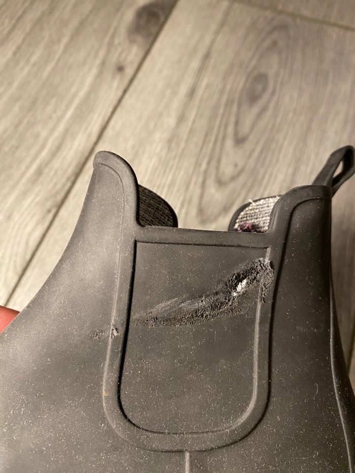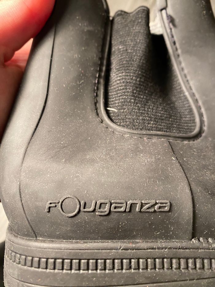 Bottine d’équitation fouganza avec des défauts. Les défaut sont juste esthétique, ne gènes pas à la monte. Convient bien à un débutant ou à des montes non quotidiennes. Imperméable, en caoutchouc, elles sont malléables et s’adaptent très bien à un petit 36 comme un grand 36. Pour toutes questions n’hésitez pas.