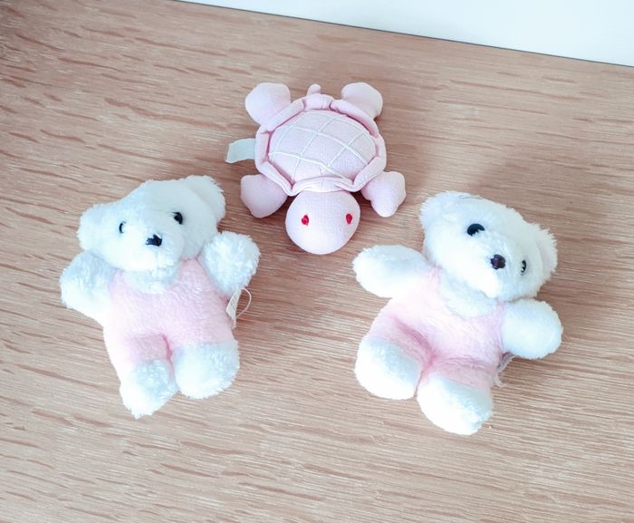 Lot de 3 petites peluches : ✓ 2 oursons rose blanc - Hauteur : 14 cm ✓ 1 Tortue rose - Hauteur : 13 cm ❌ Excellent état, juste la tortue qui a un peu perdu de sa couleur 🧼 Le tout sera entièrement nettoyée pour la vente