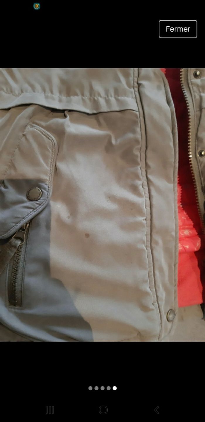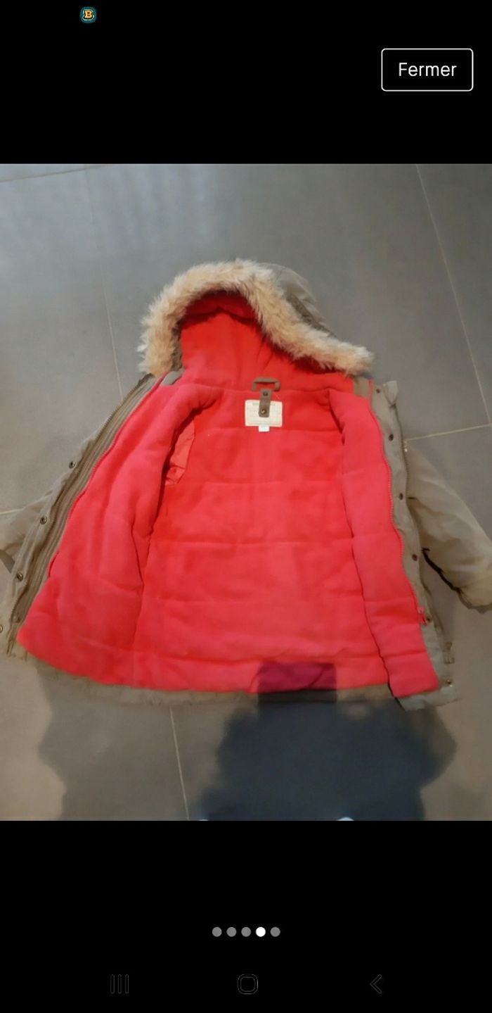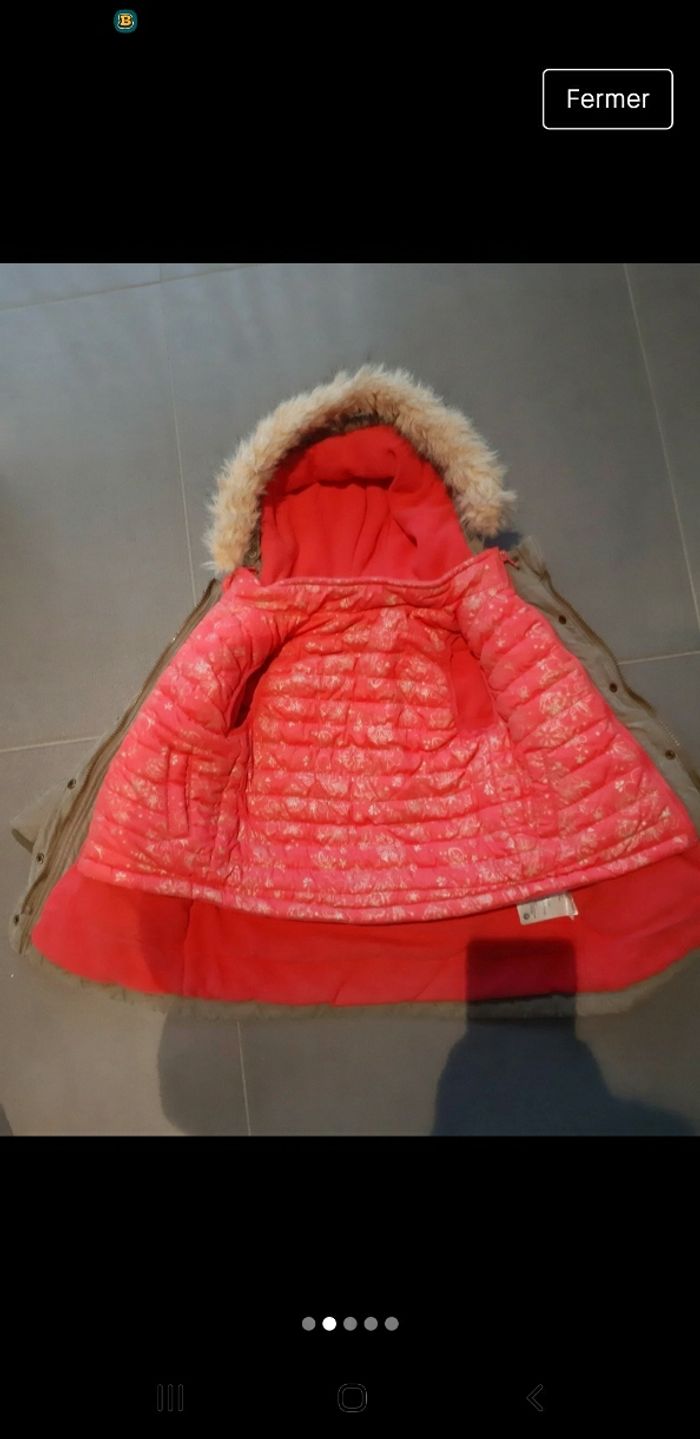 Parka fille 4 ans, couleur kaki et corail de chez Vertbaudet. La fourrure de la capuche peut s'enlever grâce à des boutons et l'intérieur de la parka est amovible en fonction du temps. Bon état, il a juste quelques petites tâches sur le bas (voir dernière photo). Maison non-fumeur.