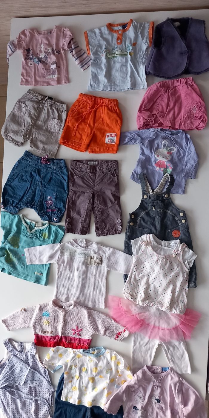 Lot comprenant: - 5 Tee-shirt manches longues - 1 barboteuse et fichu - 3 Tee-shirt manches courtes - 1 salopette - 2 pantalons - 3 shorts - 1 gilet - 1 gilet sans manche - 1 jupe - 1 leggings avec tutu