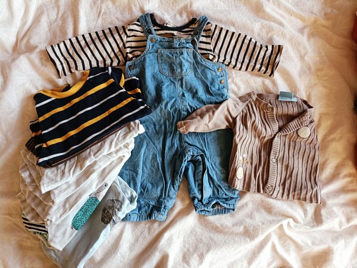 ensemble avec salopette , 6 T-shirts et un gilet. Les gilet est en naissance mais peut se porter plus longtemps car taille grand , les t-shirts sont en 3 mois + un en 6 mois et salopette en 3 mois. En bon état, mixte , les marques différent , Kiabi, petits cailloux....