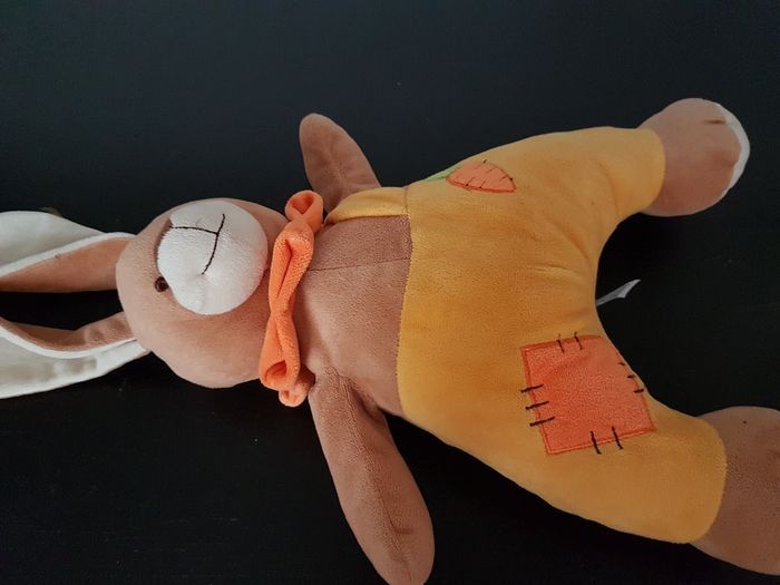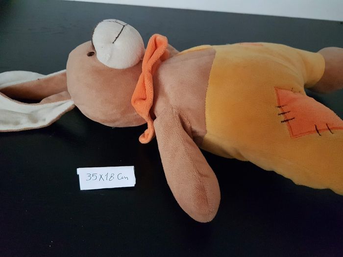 peluche lapin que je mets en vente ! Cette peluche est toute douce et moelleuse, parfaite pour câliner. Elle a un joli nœud orange autour du cou qui lui donne un air espiègle. Ses yeux noirs brillants et son sourire malicieux lui donnent un air très sympathique. Cette peluche serait un cadeau parfait pour un enfant ,taille : 35x18 cm.