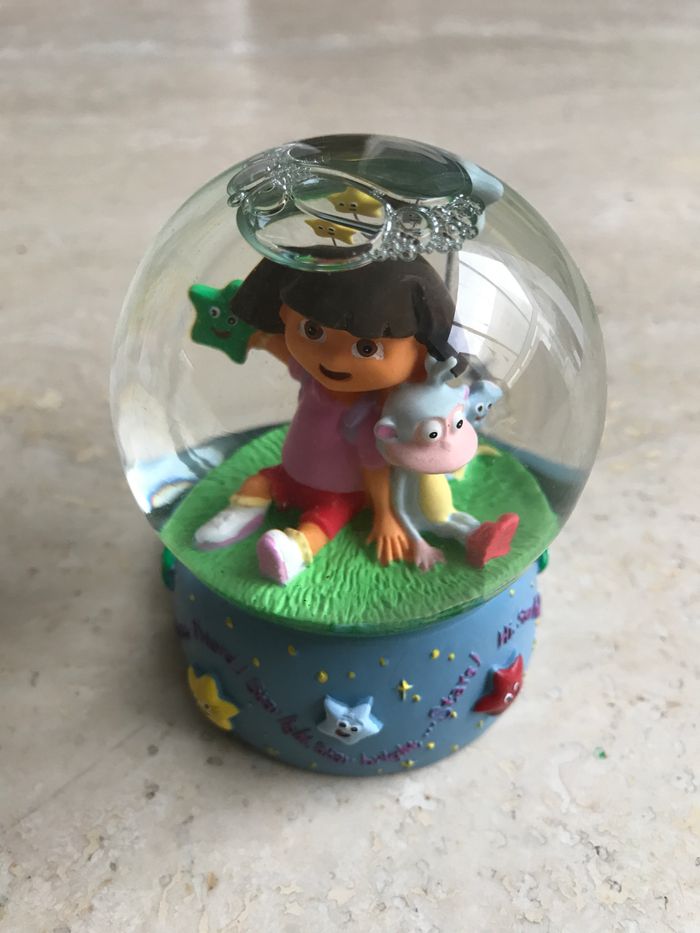 BOULE DECORATIVE EN VERRE SUR SOCLE EN RESINE "DORA L'EXPLORATRICE & BABOUCHE". Dimensions : 9 cm de hauteur et 6 cm de diamètre pour le socle. Matière : Verre et résine. Remplie d'eau uniquement (il ne s'agit pas d'une boule de neige où la neige tombe quand on la secoue). Avec Dora et Babouche. Ne fait pas de musique (article décoratif uniquement). D'occasion en très bon état.