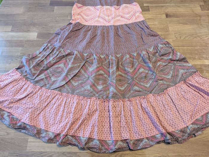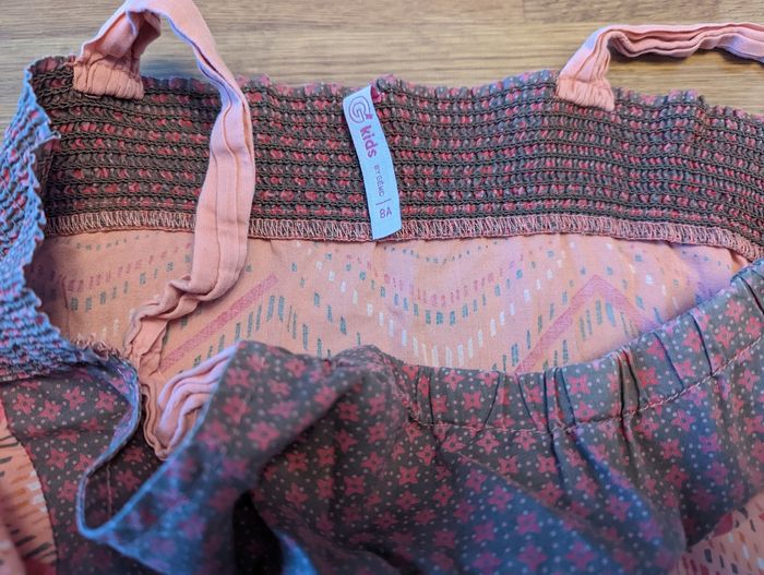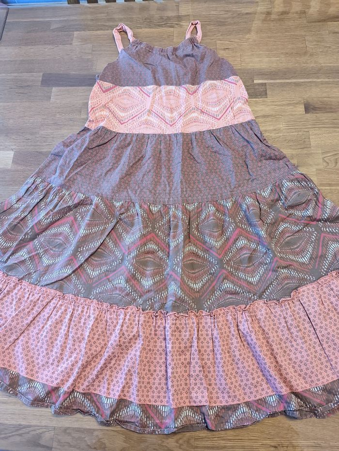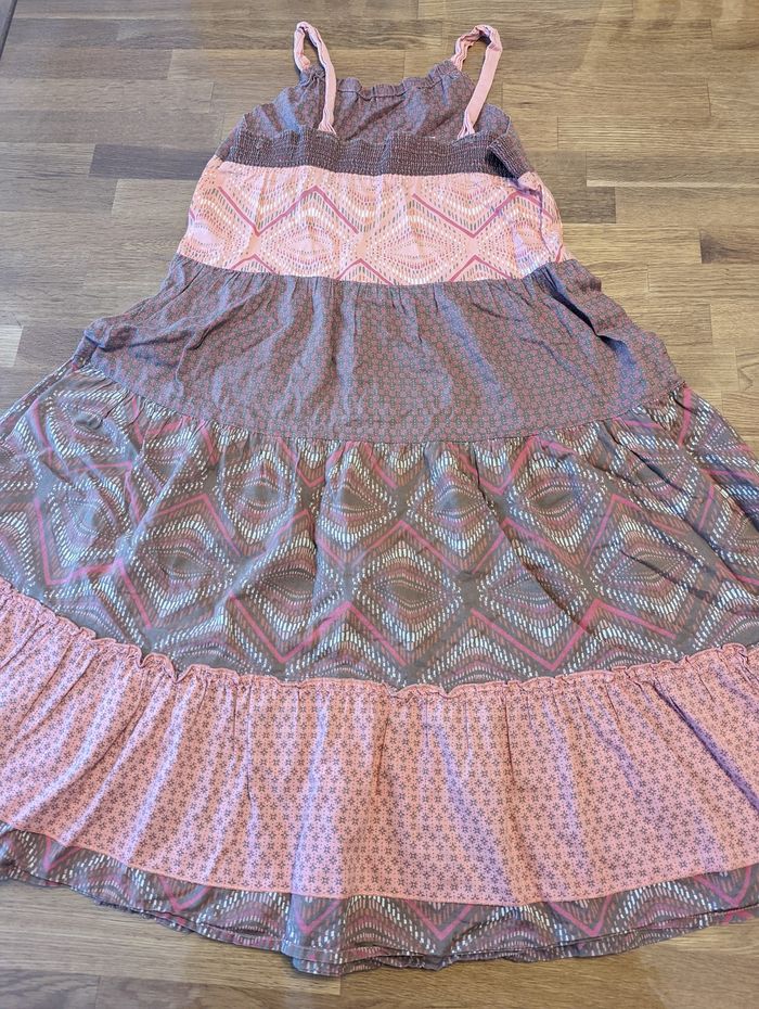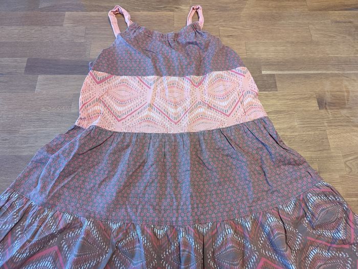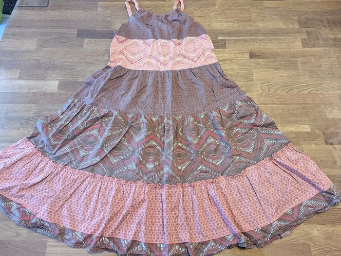 Robe longue fille 8 ans Gémo, bon état, robe très longue, marron rose et orange.