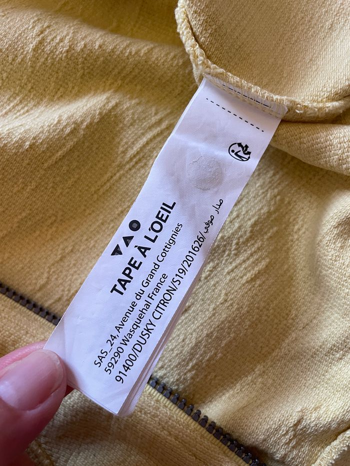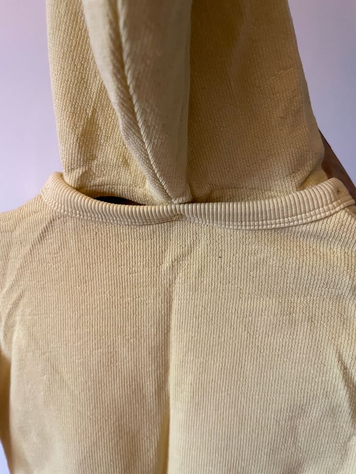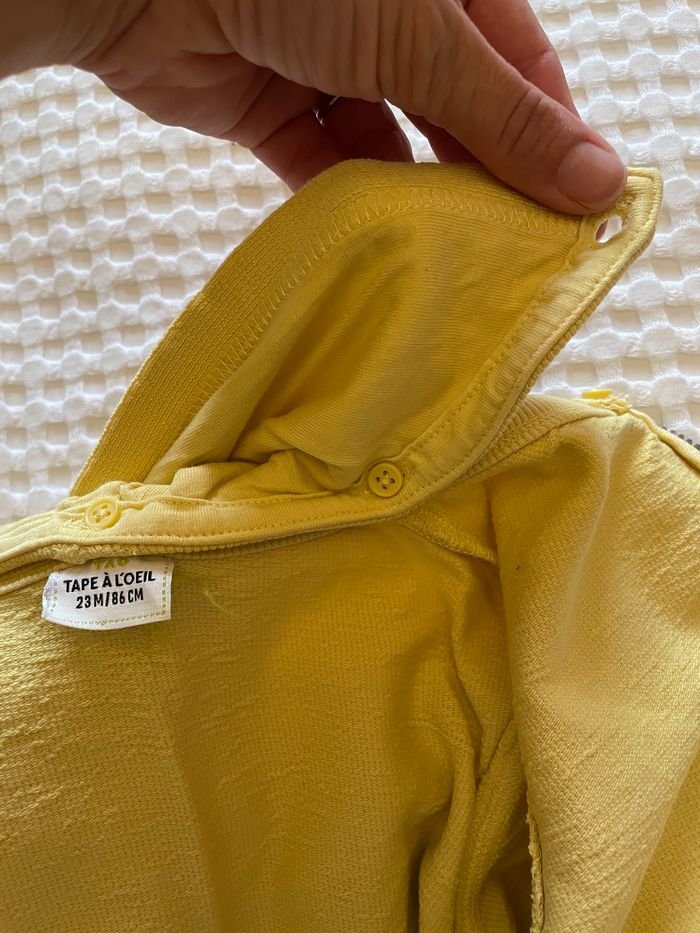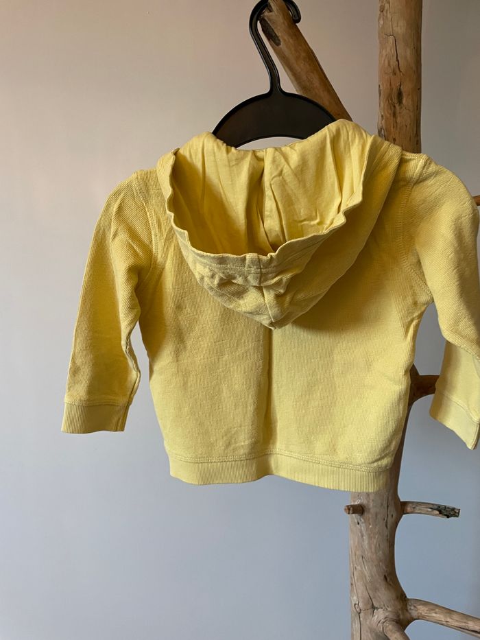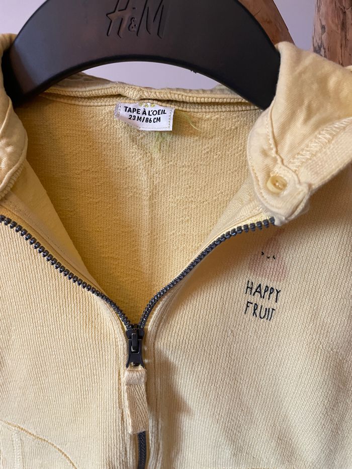 Joli sweat à zip jaune de la marque TAO. Très peu porté. Aucun défaut. Taille 23 mois. Capuche qui s’enlève par système de boutons.