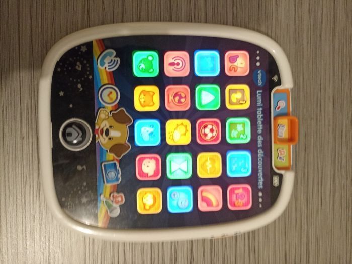 Tablette découverte 3 modes ( Tactile) Lumi marque VTECH Apprentissage, musique, Découverte Écran tactile et lumineux Jouet utilisé régulièrement. Trace noire et plus claire à l'arrière. Écran présentant des rayures, ne gêne pas l'utilisation de la tablette.