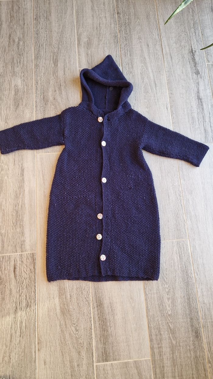 Long Gilet fait main en laine , coloris bleu, taille 4 ans