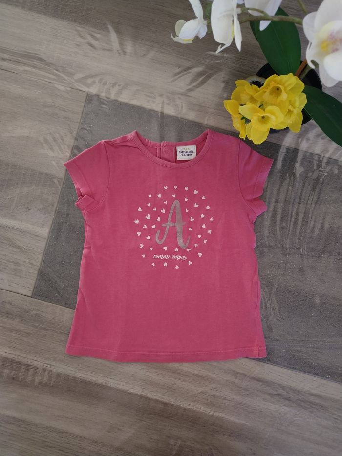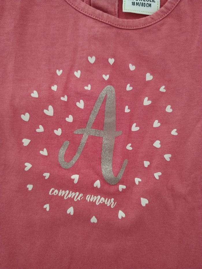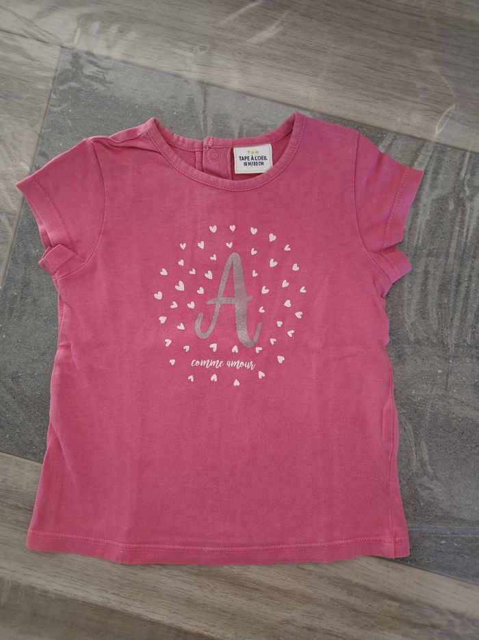 T-shirt à manches courtes Marque Tape à l'œil Taille 18 mois, 80 cm • Coloris rose, argenté, blanc • Inscription "A comme amour" • Pressions au dos • Tissu fin • Tache au dos, discrète En très bon état #evelyne_filles_18mois #evelyne_filles