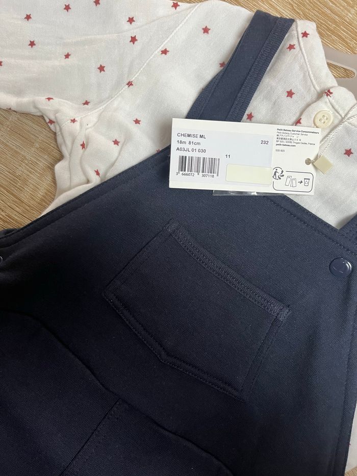 18M Chemise étoile et salopette bleu marine. Neuf avec étiquette
