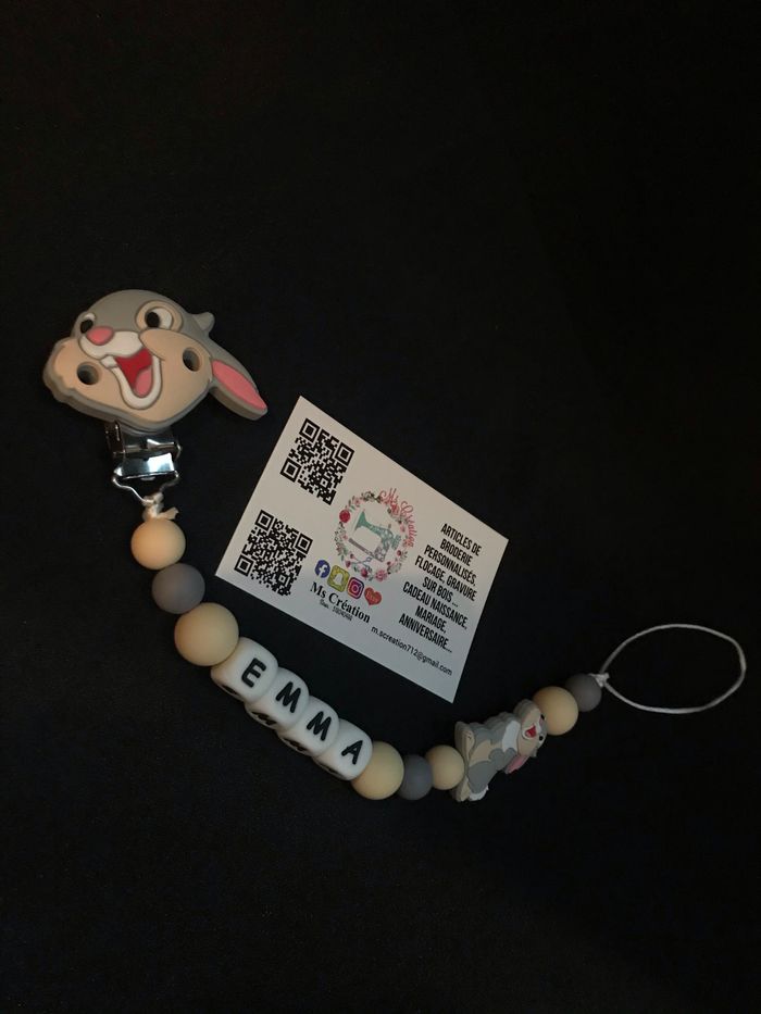 Attache tétine personnalisé en silicone Possible de le créer en d’autre modèle ( dumbo / minnie / Mickey / stitch / simba / renard / .... Une photo vous sera envoyée avant l'expédition pour que vous ayez un aperçu du rendu Tous les produits sont réalisés avec du matériel spécialement conçu et adapté (100% silicone) , aux bébés ou aux enfants, les normes de sécurité sont respectées. Produit conforme aux normes de l'UE, DIN EN 71-3 : Silicone alimentaire, sans BPA, phtalates, cadmium, ou autres métaux, entretien à l'eau savonneuse. N'hésitez pas à me contacter pour d'autres couleurs ou un produit personnalisé. Je reste à votre disposition pour composer une attache sucette à votre goût ou un ensemble cadeau bébé. ⚠️ RÈGLES DE SECURITE⚠️ ❗️❗️❗️ Cet article n’est pas un jouet ❗️❗️❗️ - Ne pas laisser l’enfant jouer avec son attache sans surveillance - Ne pas faire dormir l’enfant avec l’attache tétine - La pince de l’attache s’attache en bas du vêtement et non pas sur une partie mobile (ceinture, ruban, col…) ce qui pourrait être dangereux (risque de strangulation), ni même en haut du vêtement. Site internet : mscreation77.com