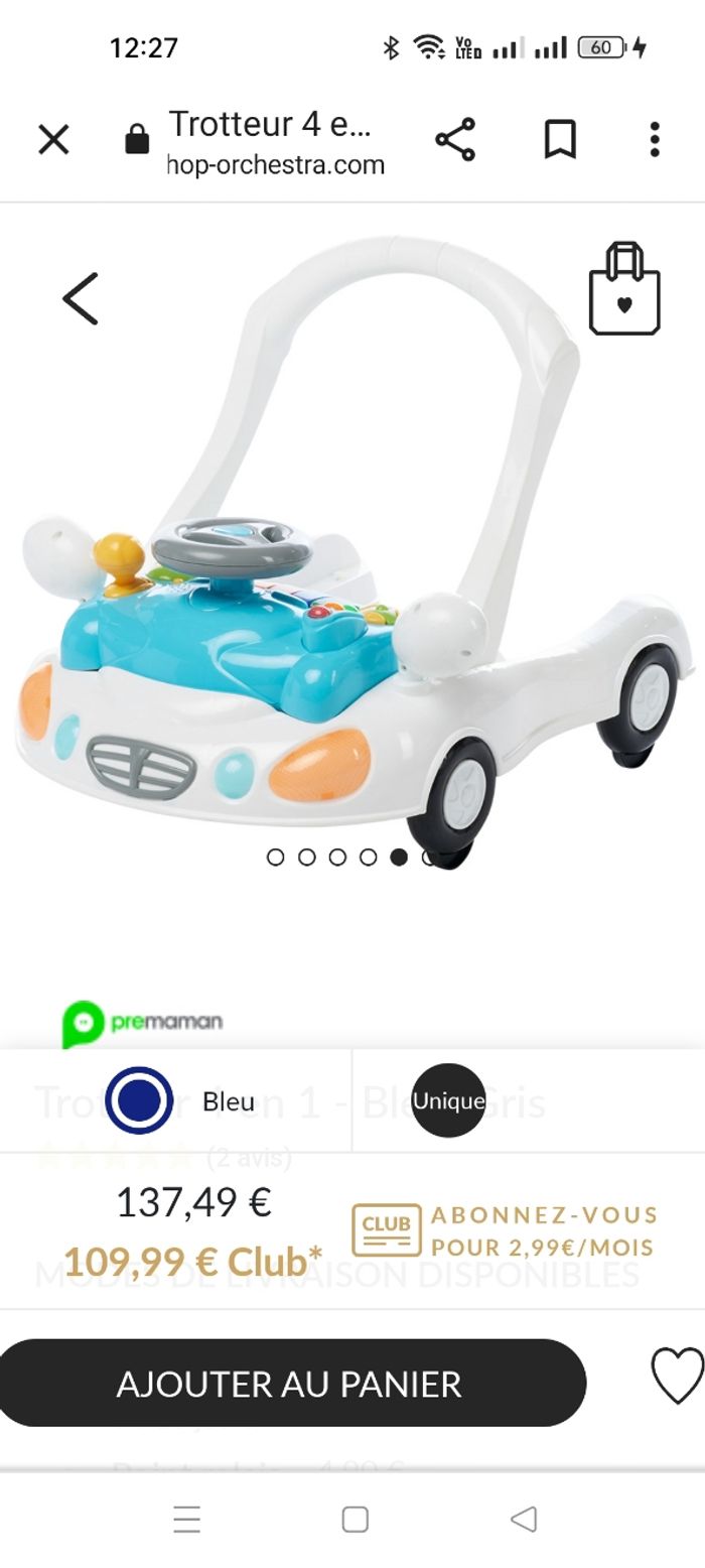Marque pré maman. Trotteur 4 en 1: trotteur, pousseur, balancelle et tablette de jeux roulante. Assise réglable en hauteur. Tablette avec set musical et lumineux amovible. Stoppeurs pour éviter les chutes.  Facilement démontable pour un rangement compact.