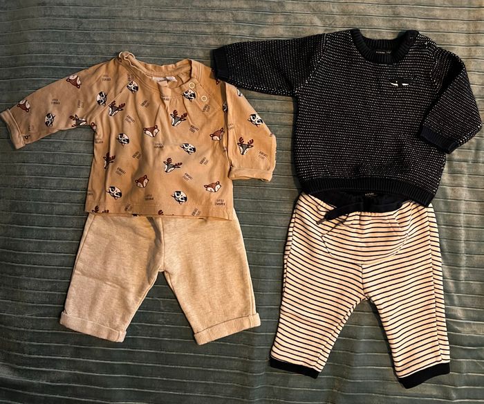 Premier ensemble de couleur beige/marron de chez Aubert 3 mois Deuxième ensemble de couleur bleu de chez kiabi 3mois Très bien état