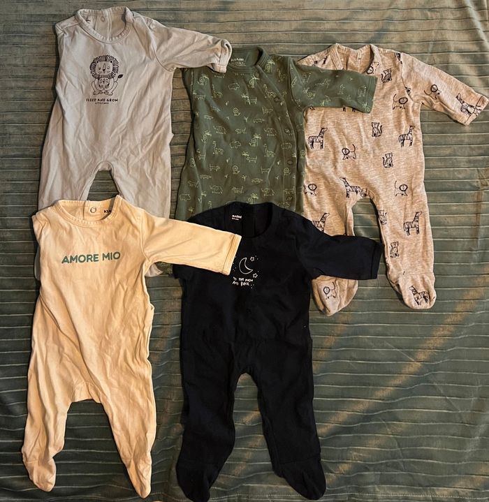 Lot de pyjama de chez kiabi et verbaudet 1 mois non portés car mon fils était beaucoup trop grand à la naissance. Très très bon état.