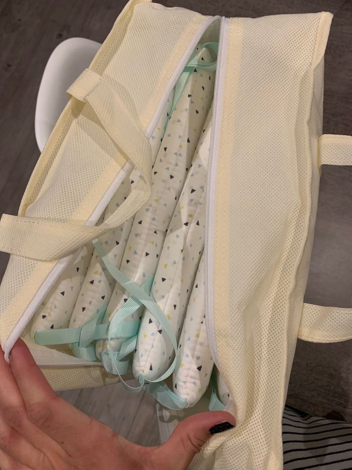 Vend tour de berceau neuf jamais utilisé. Toujours dans son emballage d origine. Belle couleur. J’ai acheté un cododo avec son tour de lit fourni, pas d utilité celui ci du coup.