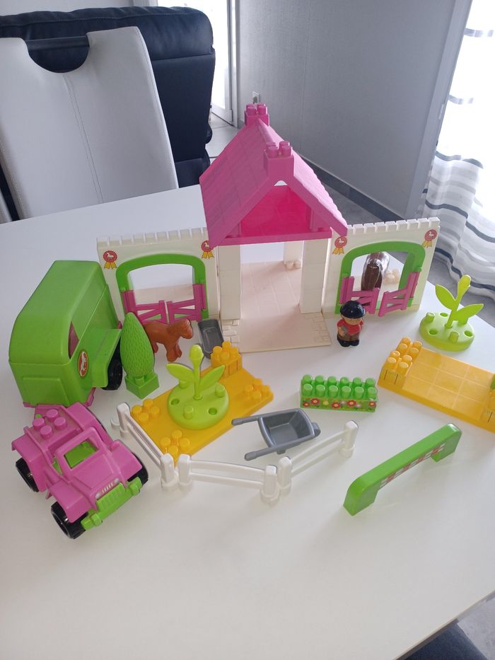 Lego écurie Il y a 2 chevaux, 1 personnage, une voiture avec sa remorque. Différents accessoires et lego. En bon état