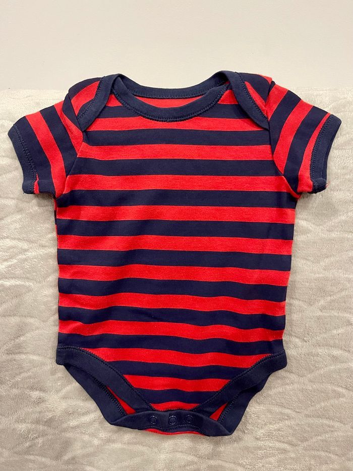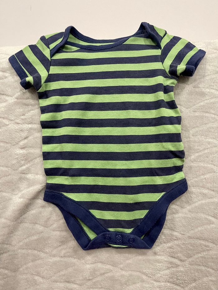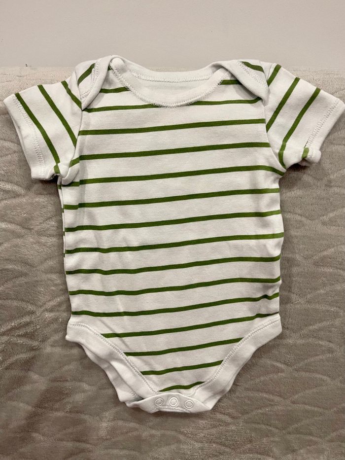 Lot de 3 bodies manches courtes 6-9 mois(74cm) en très bon etat - 1 rayé blanc et vert kaki - 1 rayé vert et bleu - 1 rayé bleu et rouge