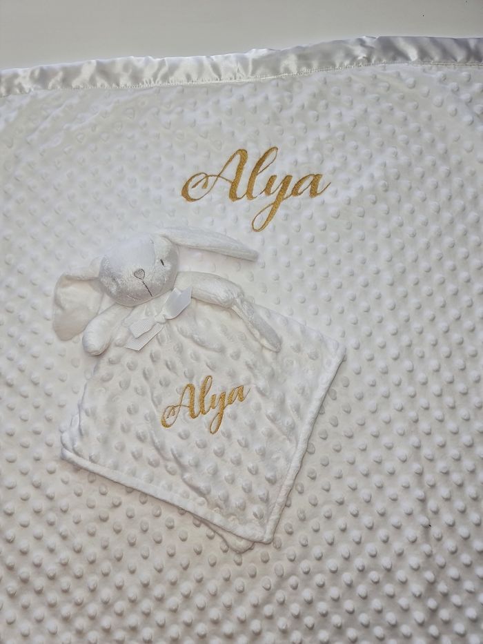 Lots personnalisés , avec le prénom de votre choix Doudou accompagné de son plaid Couverture 75x75 cm Doudou 36x36 cm prénom Broder. Couleur d'écriture au choix.