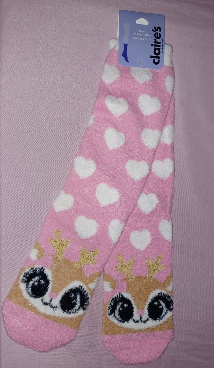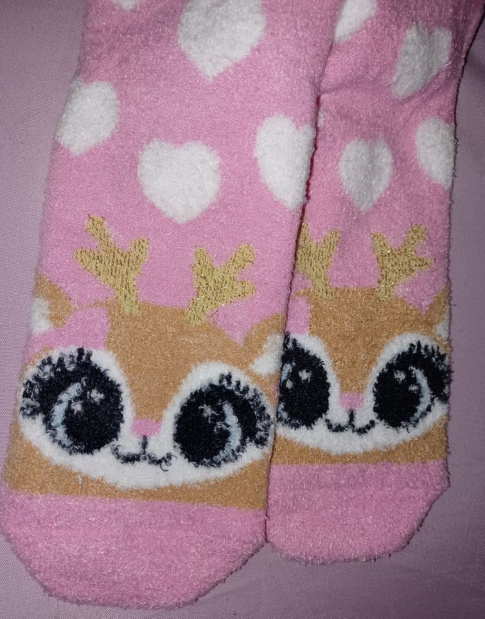 Une paire de chaussettes rose motif renne matière peluche tout doux de chez claires Taille unique convient très bien pour un enfant des 8 ans comme pour du 14 ans Matière élastique