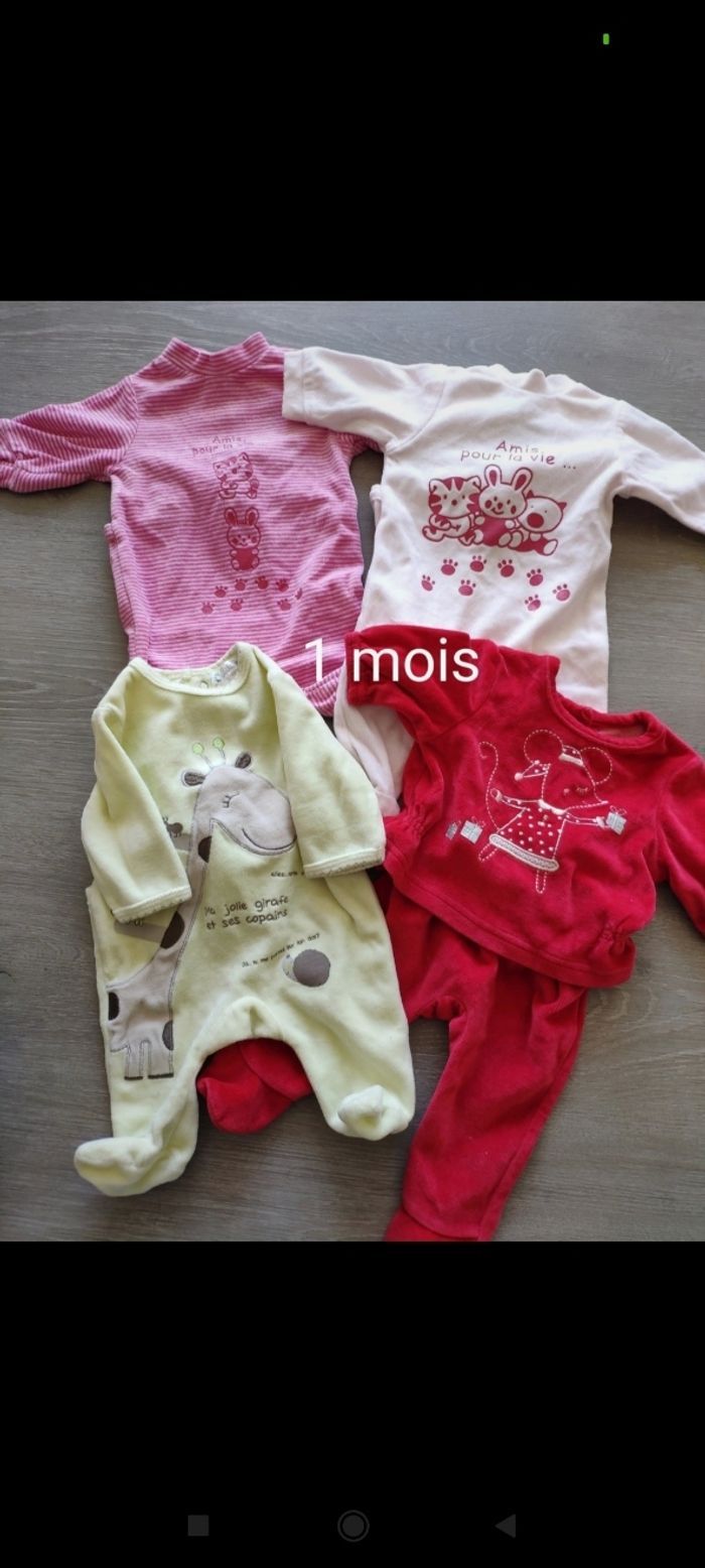 Lot de 4 grenouillères taille 1 mois, dont un en 2 pièces, les deux du haut de marque Tissaia avec pressions en plastique, le jaune girafe Kiabi, le rouge Vertbaudet. En très bon état, pas de tache, trou, défaut.