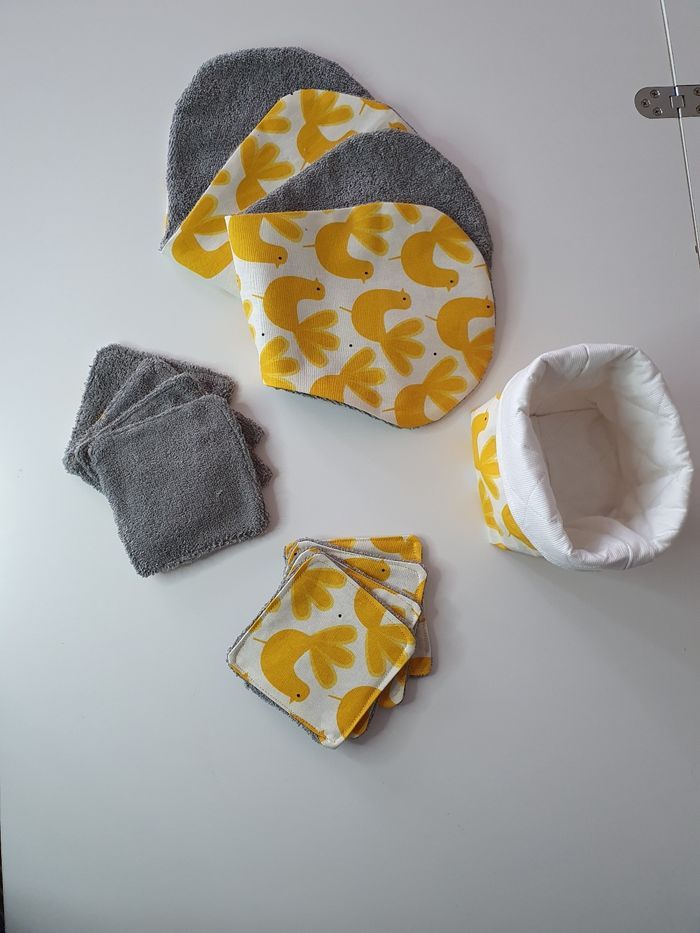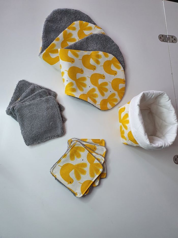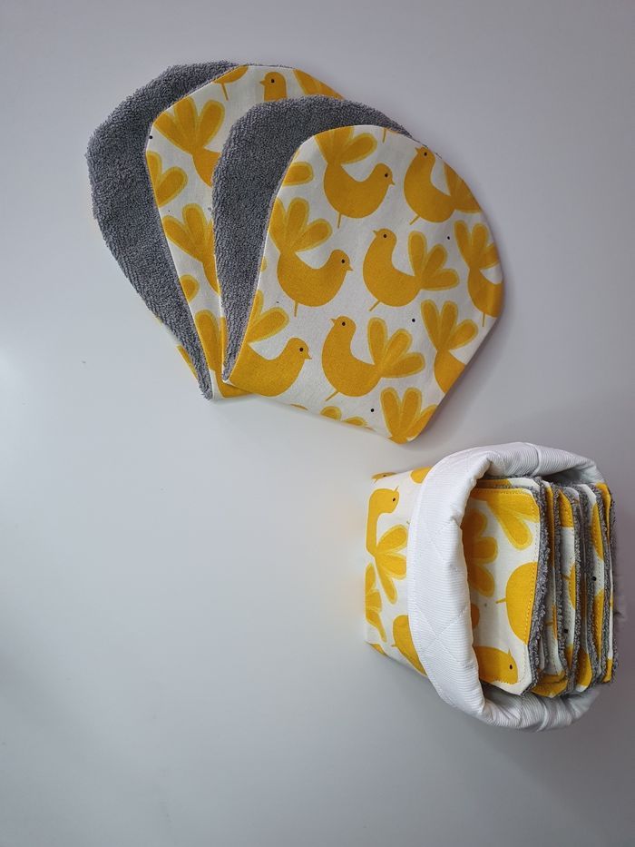 Le kit naissance comprend 2 protèges épaules anti-bavouille, 1 panier et 8 lingettes