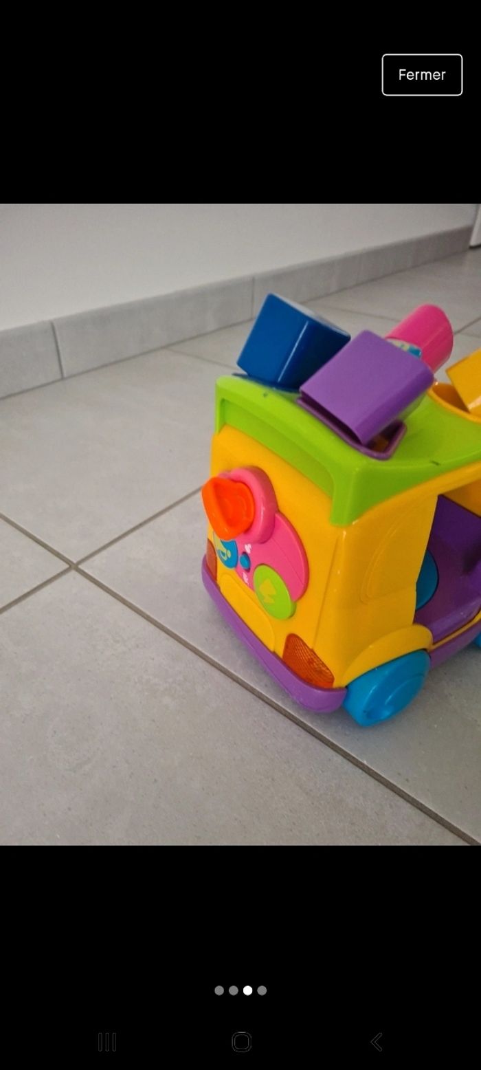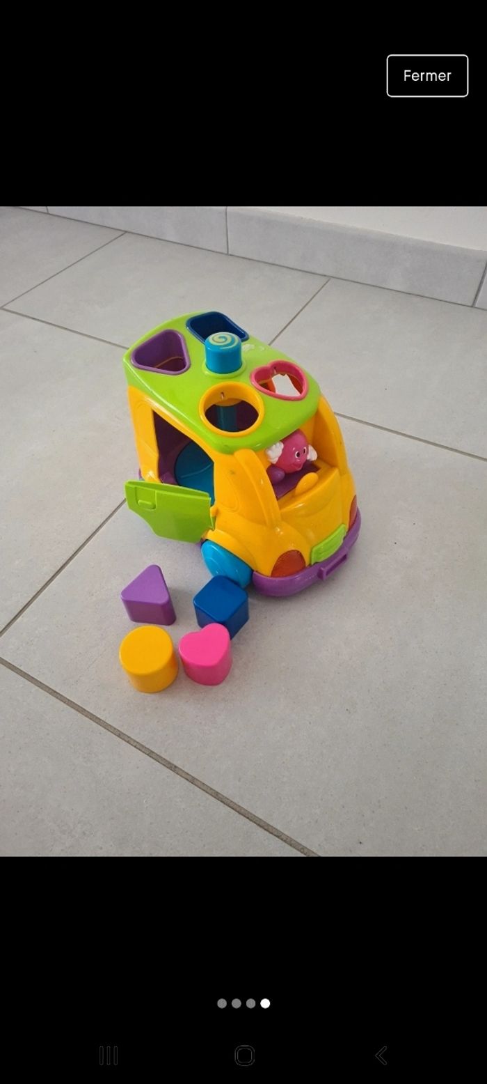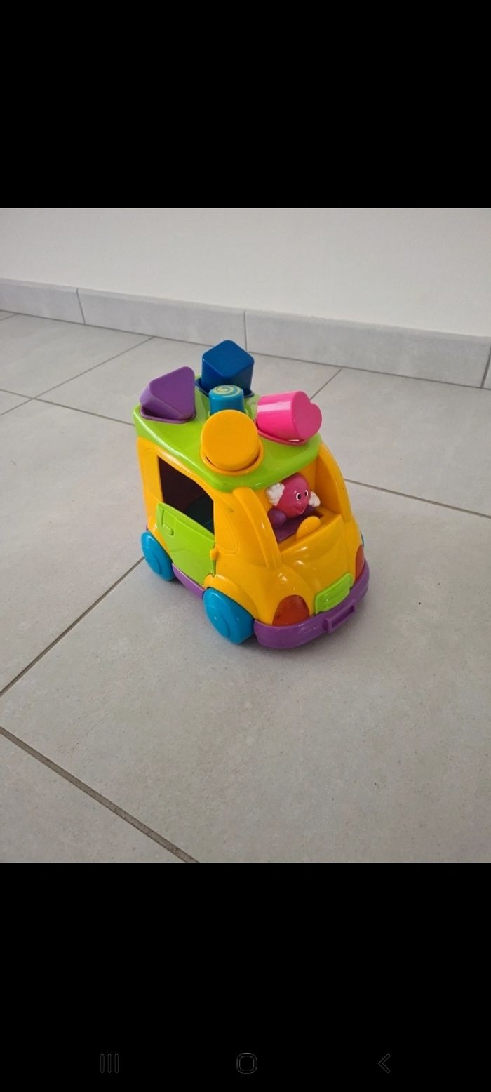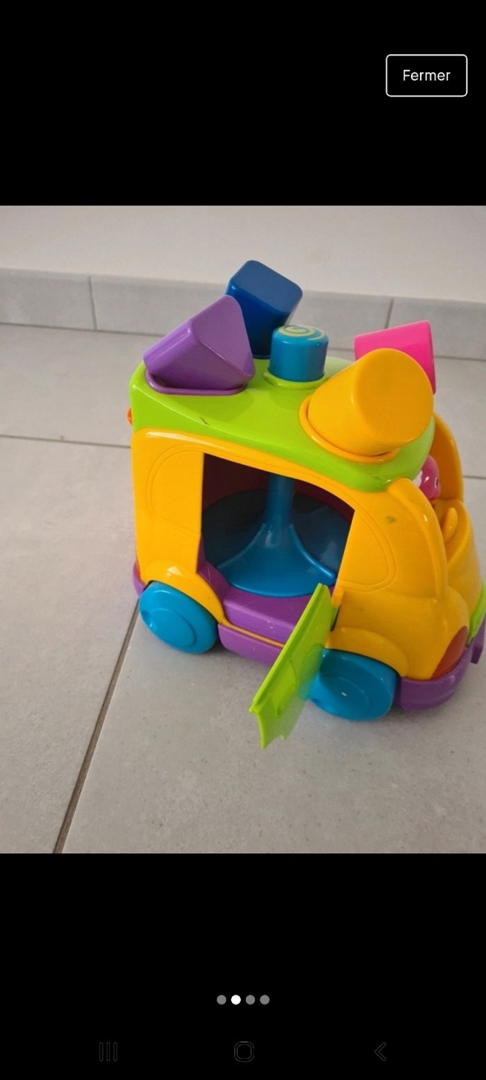Jolie petite camion pour enfiler les formes. En appuyant sur le bouton du dessus la toupi tourne et fait éjecter les formes. Et fait de la musique.