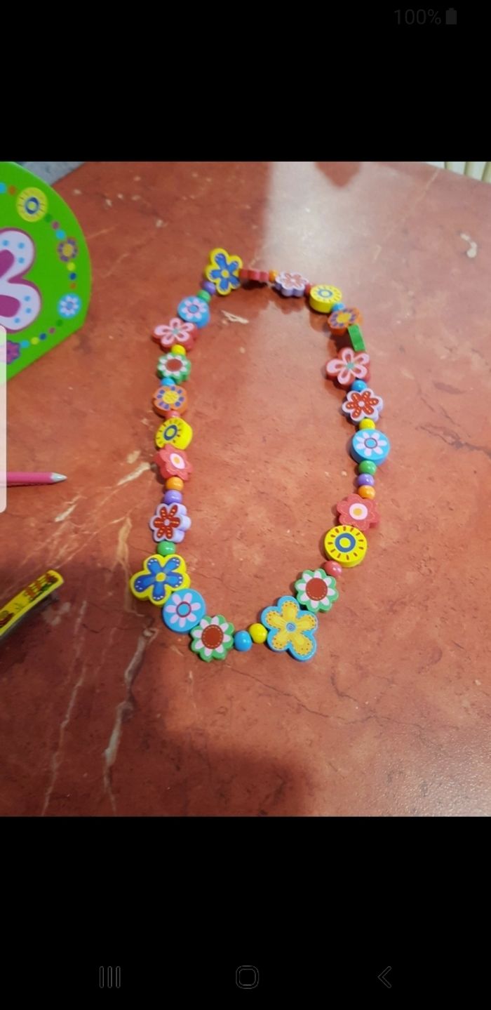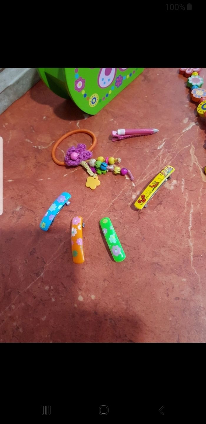 Très jolie boîte à bijoux en bois en parfait état avec un collier en perles et un élastique pour cheveux et des barrettes.