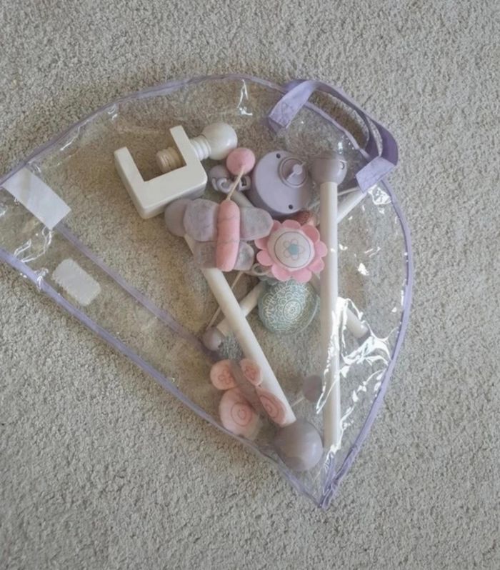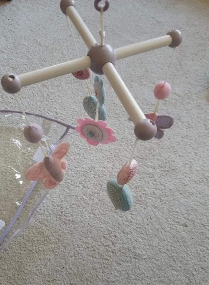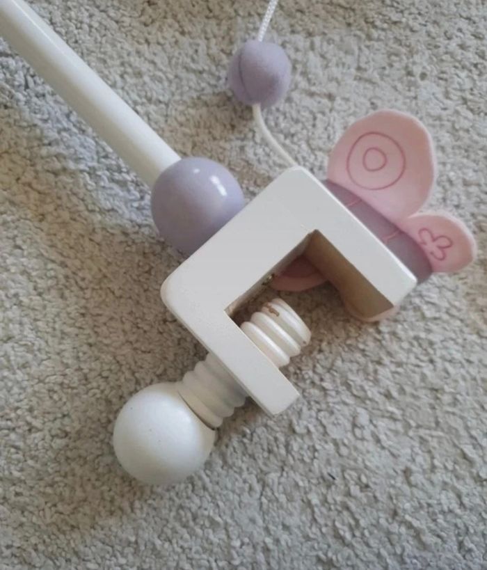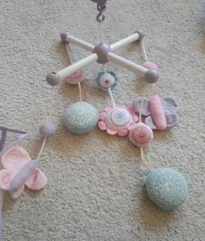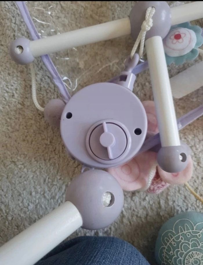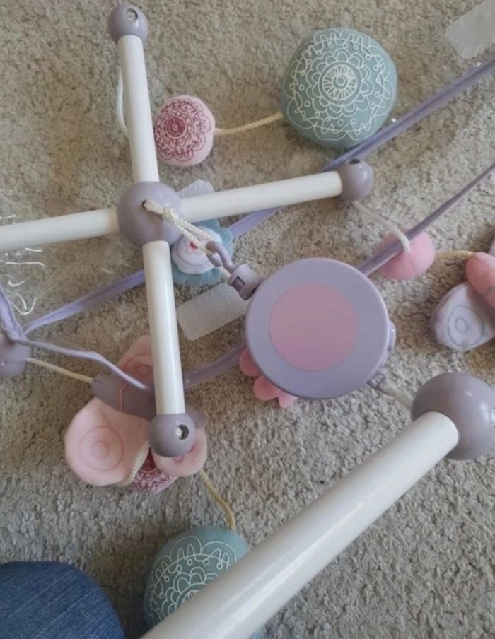 Mobile en bois vertbaudet Violet blanc et rose Légèrement jauni sur deux attaches, pouvant être démonter et laver